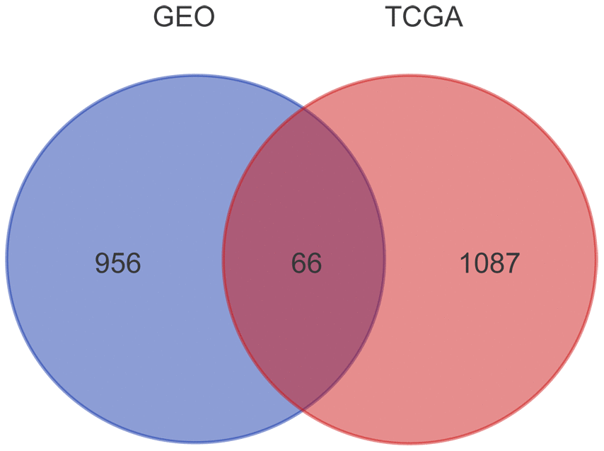 Overall, we screened 1153 and 1022 genes related with prognosis from TCGA and GSE49997 dataset, respectively. After Venn diagram analysis, 66 overlapping genes were identified as candidate genes related to EOC progression (Figure 1).