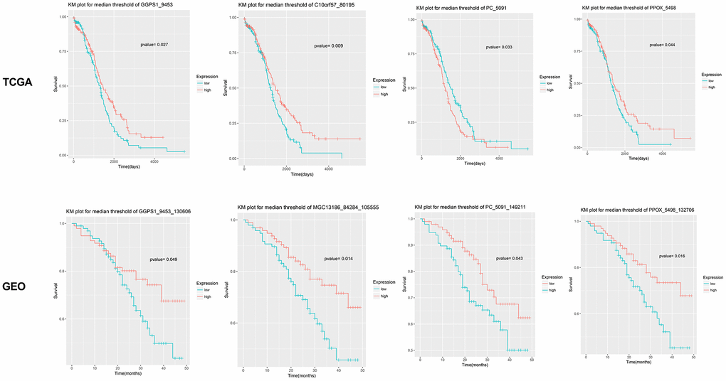 After text mining, a total of 16 genes were found to be associated with EOC (Table 1). KEGG pathway analyses showed that the metabolic pathway (hsa01100) was the most significant pathway involved with GGPS1, ME1, DSE, NTPCR (also known as C1orf57, MGC13186), PPOX, and PC (Table 2). Among the metabolic pathway-related genes, ME1 and DSE have been reported to be associated with ovarian cancer. The KM survival curve for the remaining four genes is shown in Figure 2. High expression levels of GGPS1 and NTPCR correlated with a longer patient survival time, while high expression levels of PC and PPOX were closely related to a shorter patient-survival time.