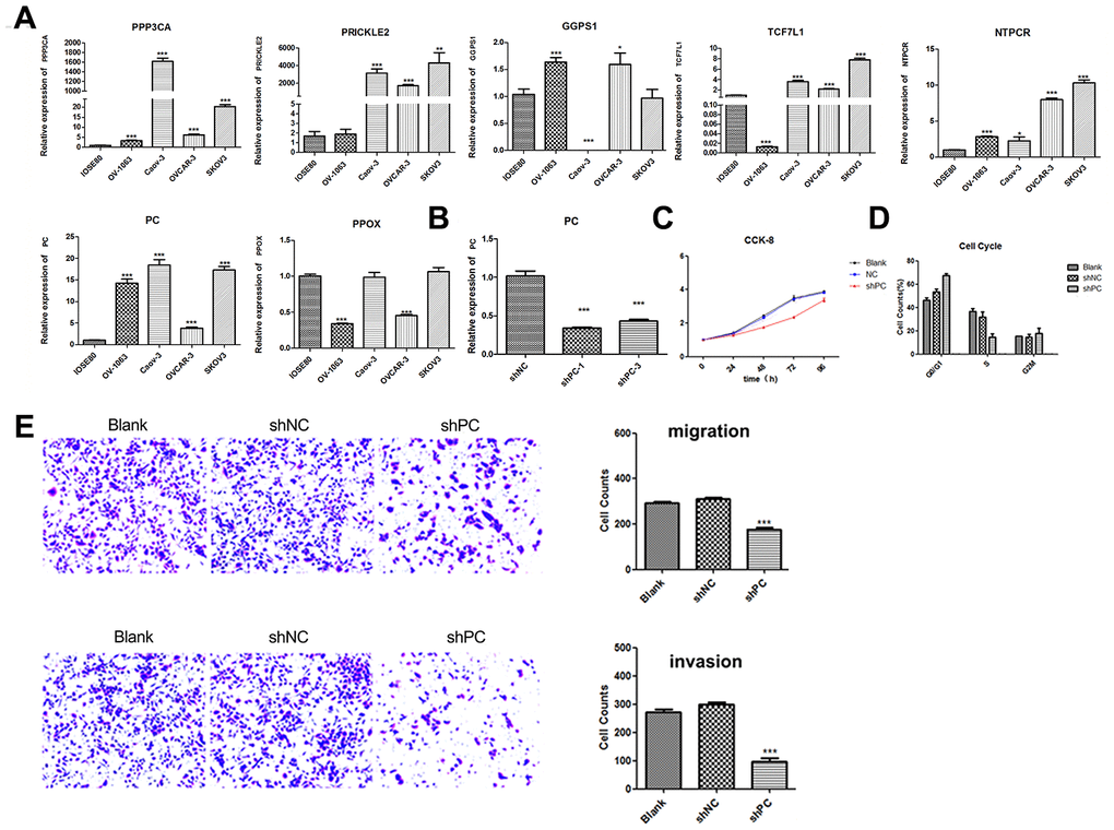 In conclusion, PC plays a significant role in the pathogenesis of ovarian cancer. The reduction of PC expression can significantly inhibit cell proliferation, cell cycle progression, and cell migration and invasion. Significantly decreased PC expression may impact ovarian tumor biology through the dysregulation of STAT1 and TP53 expression, serine and glycine biosynthesis, and ABC transporter pathways. The identified pathways in this study might provide new diagnostic and treatment options for patients with ovarian cancer.
