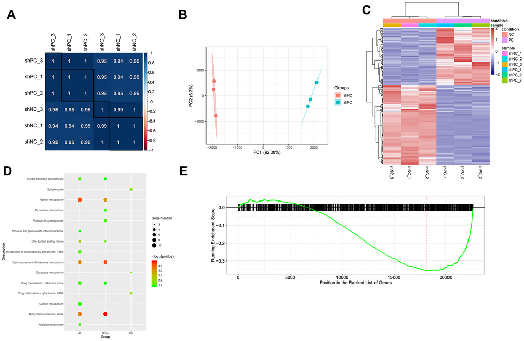 After filtering out genes with low expression levels, a total of 22,838 gene expression matrices were obtained. The correlation between samples based on gene expression was measured using the Pearson’s correlation coefficient. A heat map of sample correlation is shown in Figure 4A. PCA analysis was performed for validation (Figure 4B) and the results showed that the samples in the different groups could be distinguished. Using thresholds of |log2FC| > 1.585 and FDR < 0.05, 1404 DEGs were identified in the shPC group compared to the shNC group, including 586 up-regulated genes and 818 down-regulated genes. Bidirectional clustering analysis illustrates that the expression profiles of DEGs are significantly different between the shPC and shNC groups (Figure 4C). We further analyzed the molecular functions of the genes and found that DEGs in shPC samples were mainly associated with steroid hormone biosynthesis and drug metabolism (Figure 4D). GSEA showed that the down-regulation of genes in the shPC group was more associated with pathogenesis of ovarian cancer compared to that in the shNC group (Figure 4E).