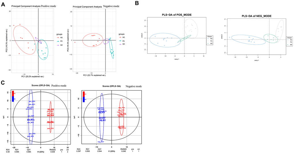After normalization, the data were subjected to PCA and PLS-DA discriminant analyses under ESI+ and ESI- modes, separately. PCA showed that the samples in the different groups could be clustered together, and there were small offsets for the QC samples, which suggested data stability (Figure 6A). PLS-DA score plots showed obvious group separation between samples, indicating that the data were stable and reliable (Figure 6B). The cumulative R2Y and Q2Y values were both close to 1.0 (Figure 6C), which indicated that the PLS-DA models were stable, credible, and supported the differences between groups.