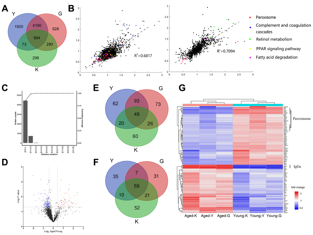 Figure 1. Differentially expressed proteins (DEPs) in young and aged mouse kidneys. (A) Comparison of three proteomic datasets: this study and (14, 16). (B) Scatter plots showing correlations between our data to G-dataset (left) and to K-dataset (right) (Red dot, Peroxisome; Blue dot, Complement and coagulation cascades; Green dot, Retinol metabolism; Yellow dot, PPAR signaling pathway; Pink dot, Fatty acid degradation). (C) Determination of the cut-off thresholds for DEPs. (D) Volcano diagram of DEPs between aged and young mouse kidneys. (E, F) Venn diagram comparing the up-regulated (E) and down-regulated (F) proteins in this study and (14, 16). (G) Hierarchical clustering of DEPs presented in all three datasets.
