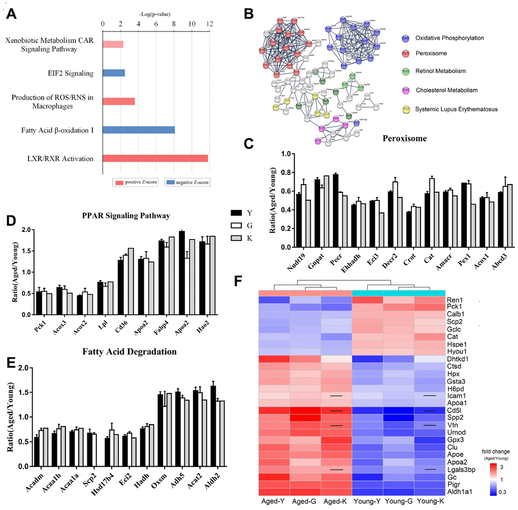 Figure 2. Biomarkers for renal aging. (A) Ingenuity Pathway Analysis (IPA) of DEPs in aged and young mouse kidneys analyzed by proteomics. (B) STRING network analysis based on robust Spearman correlation for DEPs in aged and young mouse kidneys. (C–E) Histogram of peroxisomal proteins (C), proteins associated with PPAR signaling (D), and proteins associated with fatty acid degradation pathway (E). (F) A heat-map showing biomarkers for renal aging; the black line indicates that the corresponding protein was not present in K-dataset. Error bars represent ± SEM.