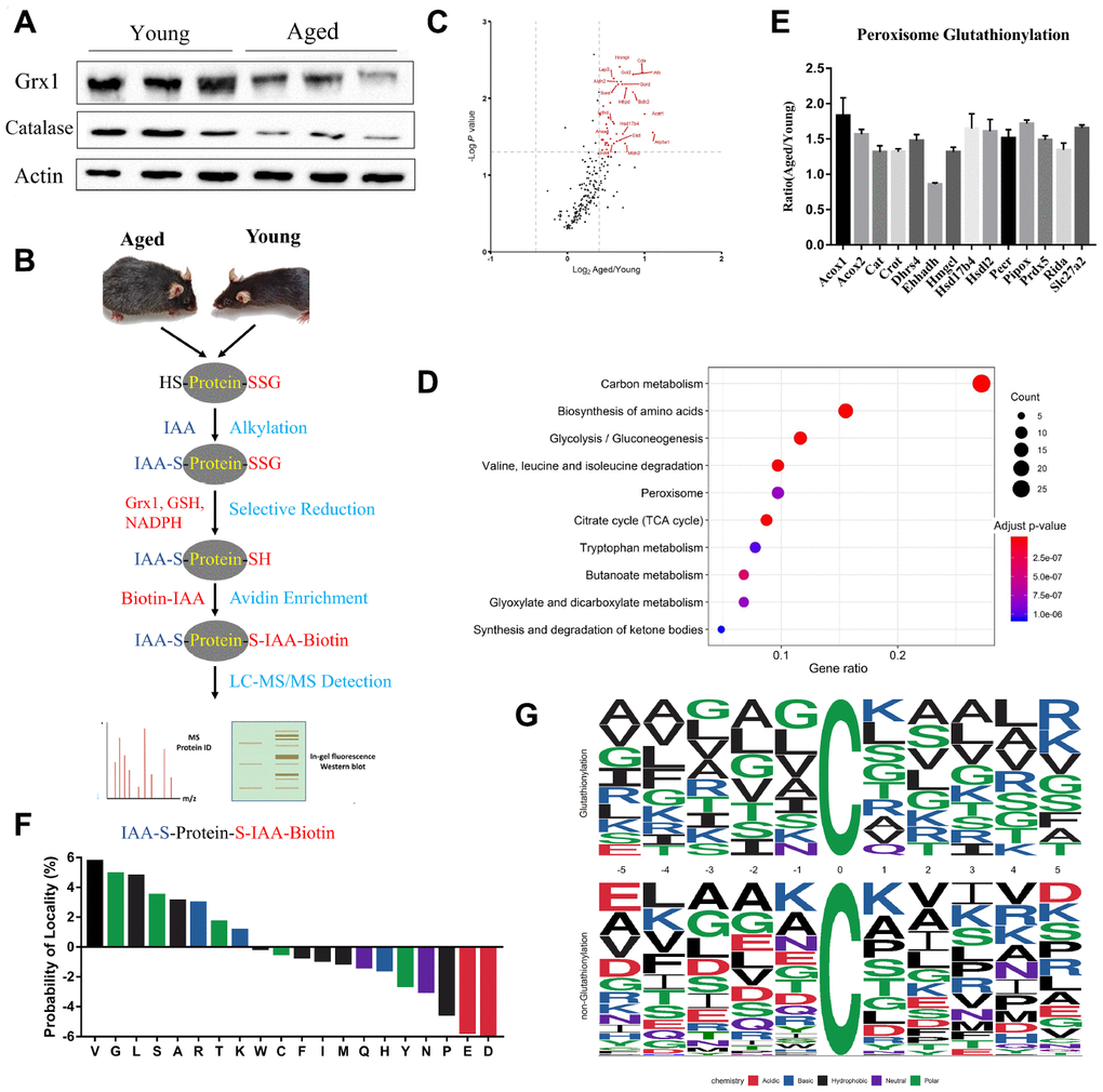 Figure 3. Profiling protein glutathionylation in young and aged mouse kidneys. (A) Western blot analysis of Glrx1 and catalase in kidney tissues. (B) Workflow of profiling cysteine glutathionylation. (C) Volcano plot of glutathionylated proteins in young and aged kidneys; glutathionylated peroxisomal proteins are red-coded. (D) KEGG enrichment analysis of glutathionylated proteins. (E) Histogram of the increased glutathionylation of peroxisomal proteins. (F) Significant enrichment of small amino acids, lysine and arginine against aspartic acid and glutamic acid at the proximal position (±five positions) to glutathionylated cysteine residues. (G) Consensus motif for glutathionylated cysteine residues shows significant enrichment of lysine and arginine across a range of proximal positions. Error bars represent ± SEM.