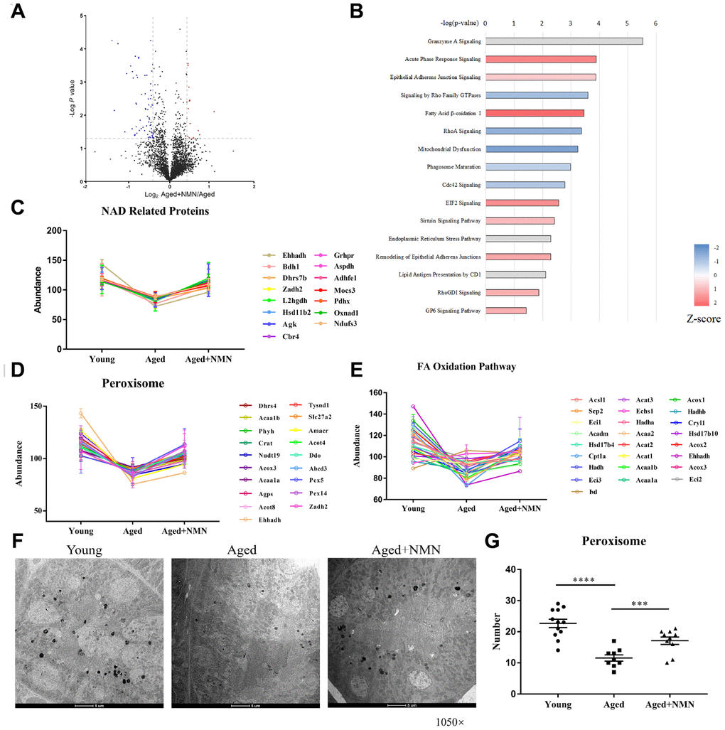 Figure 4. NMN restores proteostasis in aged kidneys. (A) Volcano plot of DEPs in untreated and NMN-treated kidneys. (B) IPA analysis of DEPs in untreated and NMN-treated kidneys (p < 0.05). (C) Expression of NAD-dependent oxidoreductase. (D–E) Expression of proteins associated with peroxisomes (D) and fatty acid oxidation pathways (E). (F) Electron micrograph showing part of the mouse kidneys stained for catalase by DAB. The electron-dense reaction product of DAB is observed in the matrix of all peroxisomes, while mitochondria and other components of the cytoplasm are not stained. (Mag. ×1,050). (G) The number of peroxisomes in young, aged and NMN-treated kidneys based on electron micrographs. Data were analyzed using Student’s t-test. *p < 0.05, **p < 0.01, and ***p < 0.001. p < 0.05 was considered statistically significant. Error bars represent ± SEM.