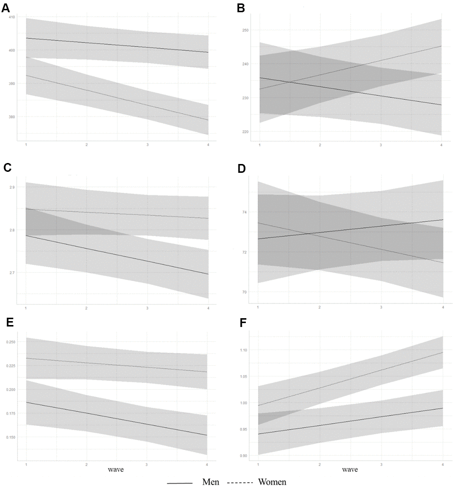 We also found a significant sex difference in AACS for sleep duration, mid-sleep time, sleep efficiency, and sleep quality under the adjusted model. Post hoc analyses revealed that only women showed decreased sleep duration, delayed mid-sleep time, and decreased sleep efficiency over a period of 6 years (Table 3). Sleep quality worsened in both groups but a more pronounced change was observed in women. The AACS of daytime dysfunction was found only in men with a worsening trend.
