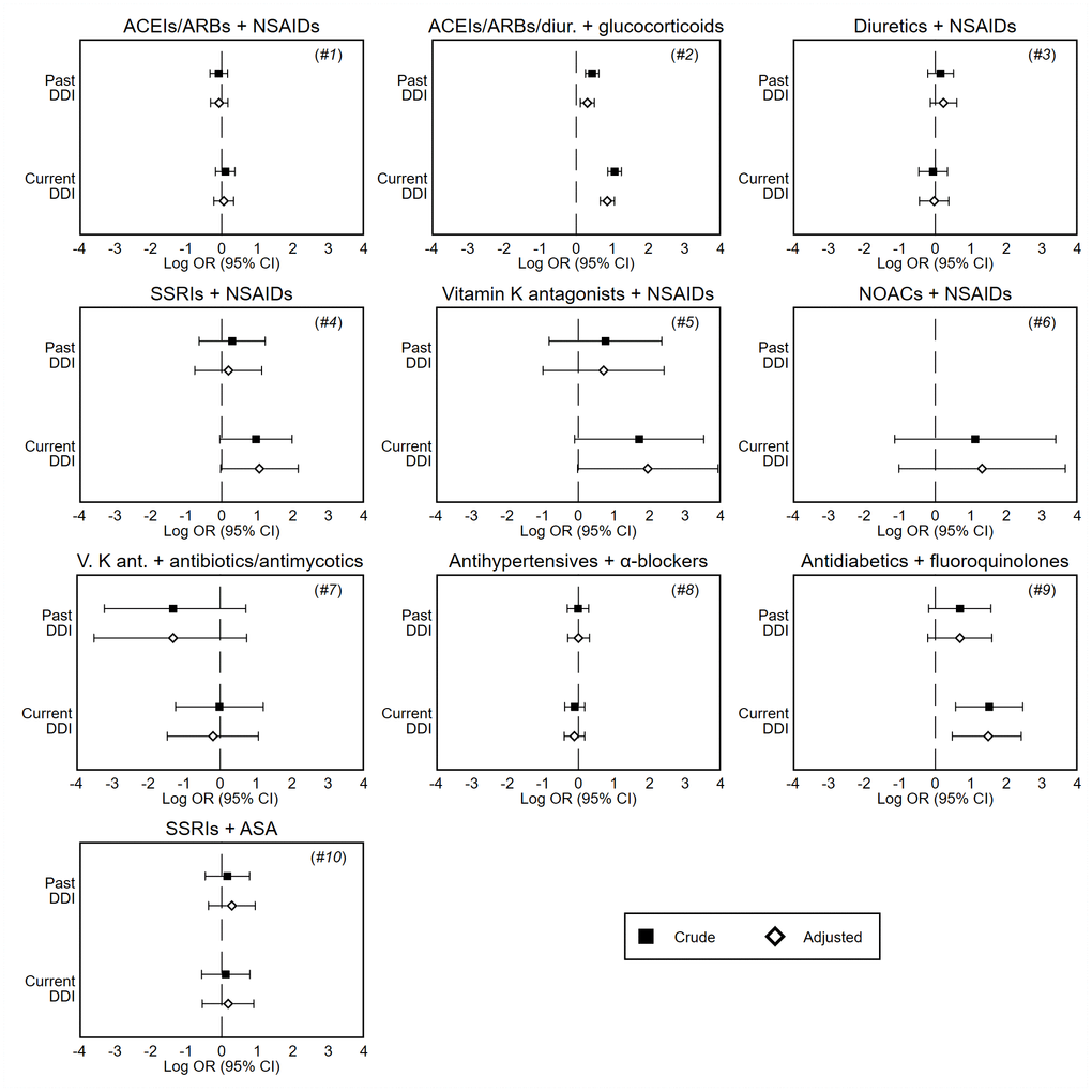 Table 3 and Figure 1 show the results of the primary analysis. After adjusting for potentially confounding factors, we found that the combination of antihypertensive therapy (ACEIs/ARBs or diuretics) and glucocorticoids (analysis #2) was associated with an increased risk of hospitalization. This association reached statistical significance for both current (adj. OR 2.36; 95% CI 1.94-2.87; P <0,001) and past users (adj. OR 1.36; 95% CI 1.12-1.65; P 0.002). The vast majority of these hospitalizations were due to cardiovascular diseases (37.5% heart failure, 32.5% cerebrovascular events, 12.0% AMI, 5.8% hypertensive crisis), while the remaining ones were due to acute kidney failure (10.6%) and hyponatremia (1.7%). We also found an increased risk of hospitalization among current users of antidiabetics and fluoroquinolones (analysis #9: adj. OR 4.43; 95% CI 1.61-11.2; P 0.003); complications of diabetes accounted for the most hospitalizations (90.9%), followed by hypoglycemic coma (9.1%). In analysis #4 (SSRIs plus NSAIDs) and #5 (vitamin K antagonists plus NSAIDs) current users showed an increased risk, but failed to achieve statistical significance (analysis #4: adj. OR 2.88, 95% CI 0.97-8.59; analysis #5: adj. OR 7.01, 95% CI 0.98-50.4). These two interaction analyses had limited statistical power due to the low number of cases exposed to DDIs, as also confirmed by the large minimum detectable effect sizes (analysis #4: OR 3.92; analysis #5: OR 7.61).