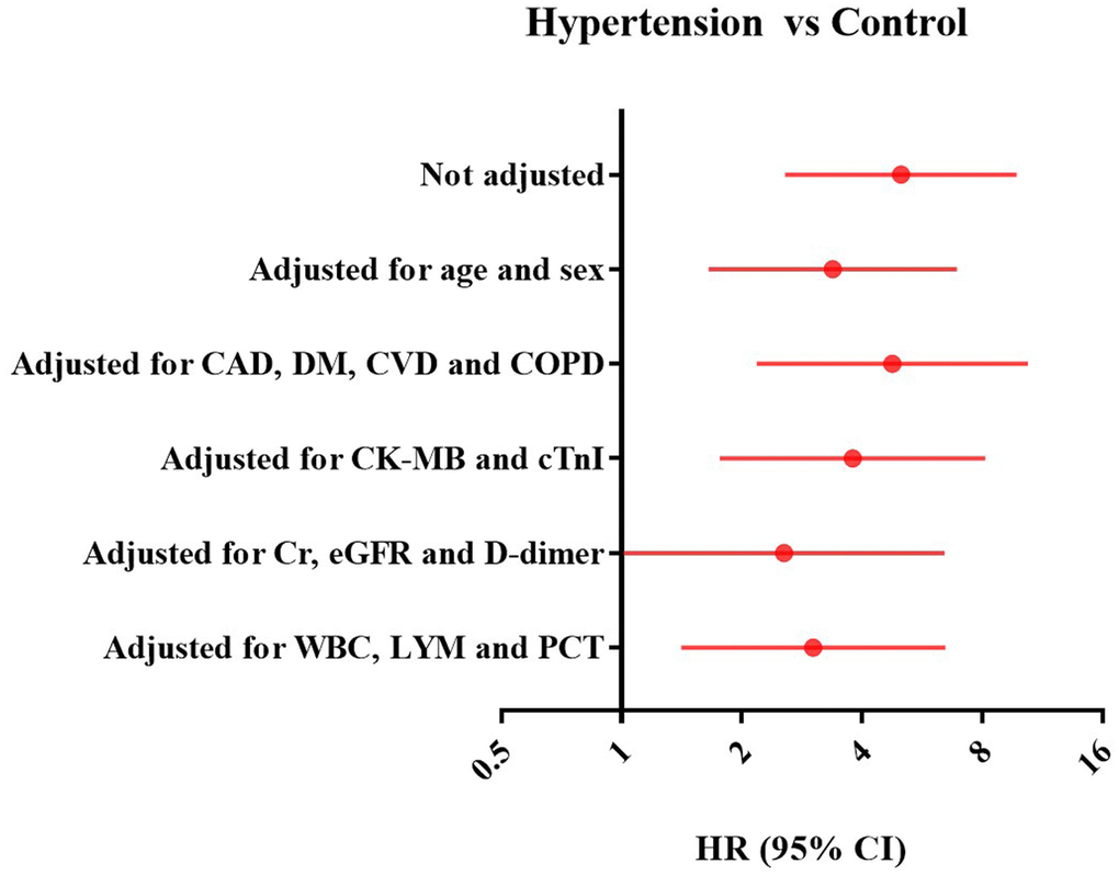 In terms of laboratory findings, patients with hypertension compared with patients without hypertension showed higher median creatinine kinase–myocardial band (CK-MB, median [IQR], 2.04 [1.02-3.61] ng/mL vs 0.95 [0.60-2.12] ng/mL), high-sensitivity cardiac troponin I (hs-cTnI, median [IQR], 17 [0-71] pg/ml vs <6 pg/ml), N-terminal pro-B-type natriuretic peptide (median [IQR], 537.8 [172.6-1340.5] pg/mL vs 120.2 [36.7-391.9] pg/mL), white blood cell count (median [IQR], 6260 [4400-8200] cells/μL vs 5170 [3950-6700] cells/μL), and levels of D-dimer (median [IQR], 1.83 [0.56-8.90] mg/L vs 0.61 [0.36-1.98] mg/L), creatinine (median [IQR], 69 [51-84] μmol/L vs 59 [49-72] μmol/L) and lower estimated glomerular filtration rate (eGFR) (median [IQR], 89.3 [58.3-99.1] μmol/L vs 103.9 [91.5-118.0] μmol/L) at admission (Supplementary Table 1).