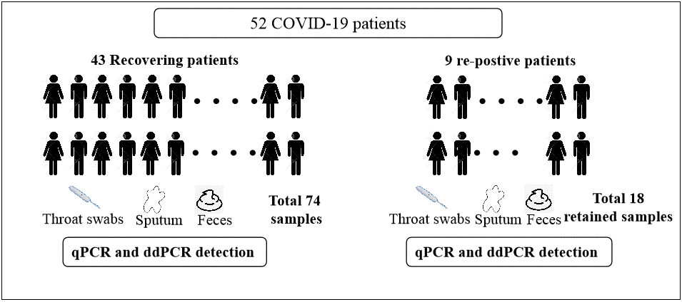 As shown in Figure 2, between February 29 and March 6, 2020, we collected 74 clinical samples from 43 recovering COVID-19 patients. These included 36 feces samples, 36 sputum samples, and 2 throat swabs. In addition, we selected 9 patients, who relapsed and were again positive for viral RNA after discharge. The 18 retained samples collected from these 9 patients before their first discharge included 3 sputum samples and 15 throat swabs.
