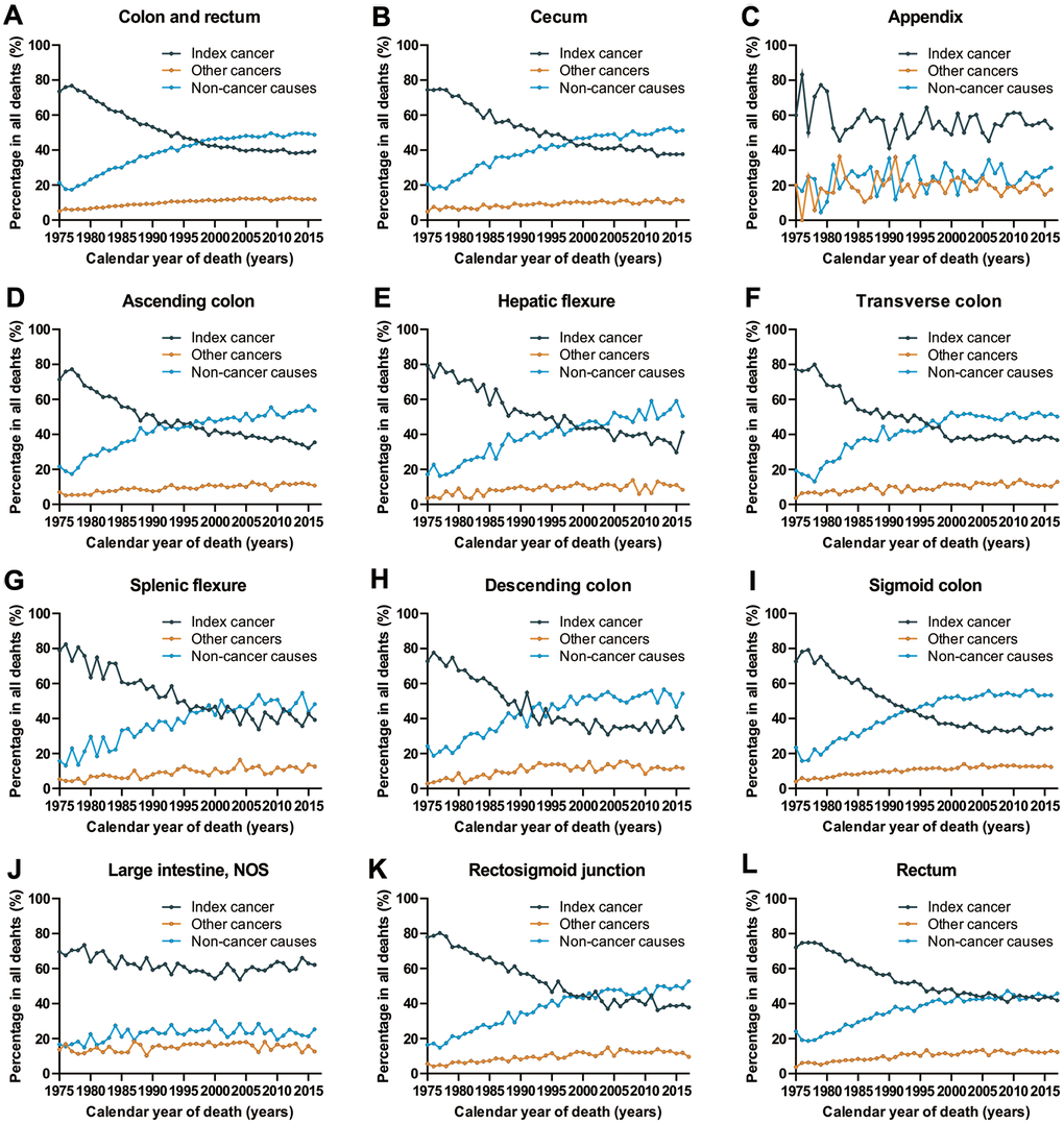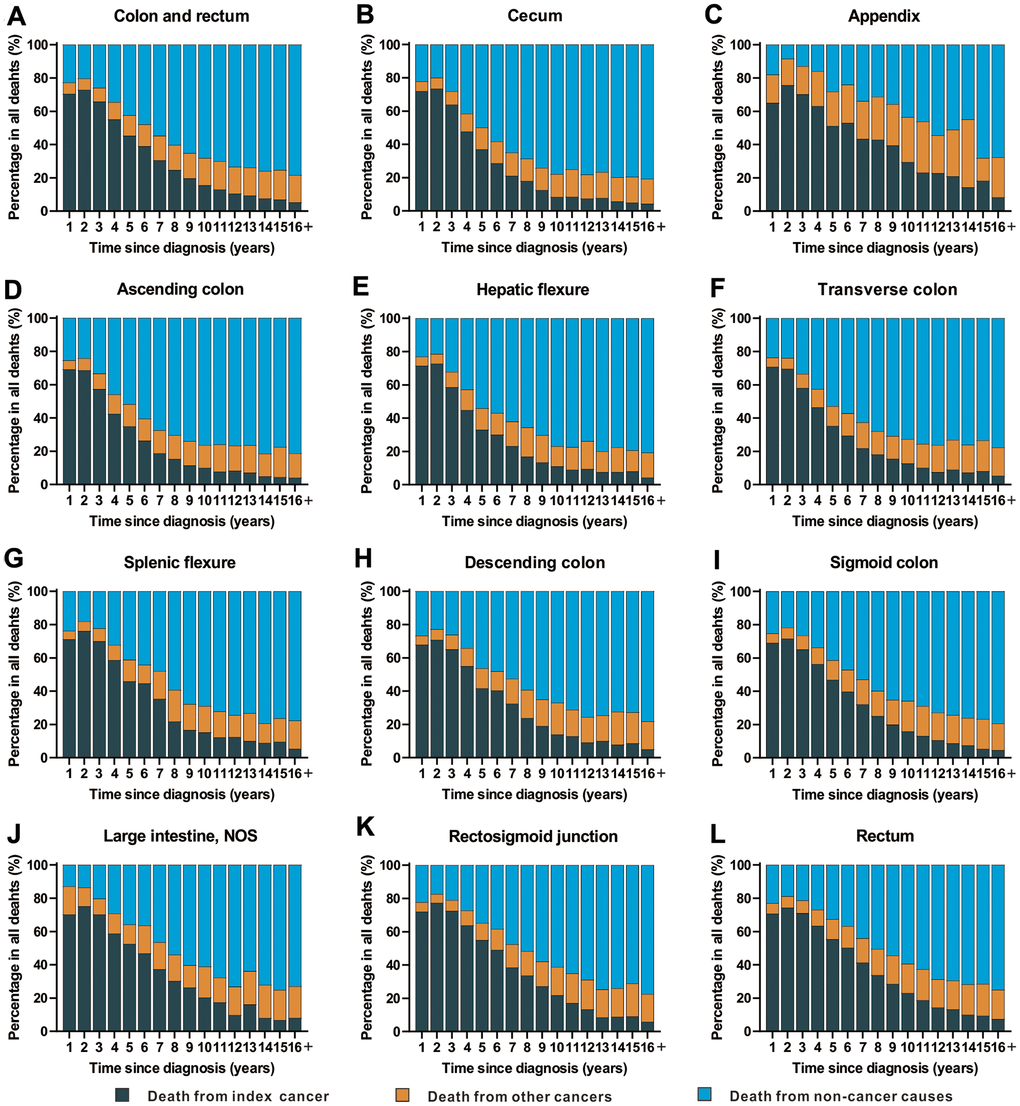 This study has some limitations. First, there is a risk of reporting bias in death certificates which could lead to misclassification of causes of death [53, 54]. However, the SEER mortality data were provided by the NCHS (National Center for Health Statistics) and NVSS (National Vital Statistics System) and systematic and standardized data collection procedures are used to ensure that the causes of death recorded in SEER are accurate [55]. Further, previous studies have also examined the validity and reliability of the use of death certificates recorded in the SEER and the results suggested that they were acceptable [56, 57]. Second, SEER does not contain information regarding pre-existing comorbidities, performance status, quality of life, as well as detailed and complete information of cancer treatment. Thus, we were not able to analyze the cause and effect relationship between different risk factors and distinct causes of death. Nevertheless, analyzing the extensive amount of data available from the SEER database remains a powerful, useful, and integral tool in medical research for the purpose of exploratory analyses [55]. Third, we were unable to obtain data on genetic information (such as MMR (defective mismatch repair) genes or mutations status of KRAS and BRAF) and dietary habits, which prohibited us from taking these features into account.