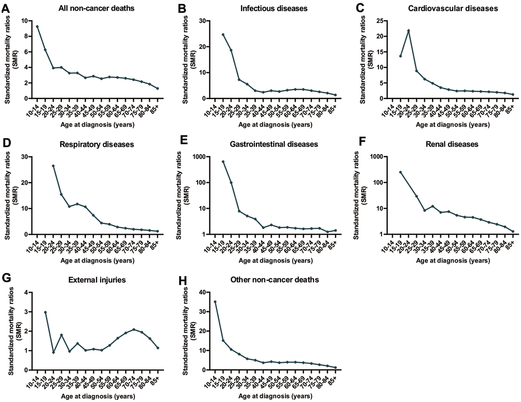 Our work also evaluated the cause of death among cancer patients as a function of age at diagnosis. We found that the proportion of non-cancer deaths, especially the cardiovascular diseases, were increasing with an increased age. Most patients with colorectal cancer are older and may have multiple comorbidities. In a study from Canada, the researchers found that cardiovascular diseases is the major non-cancer cause of death in the elderly CRC patients [30], consistent with our results. Age is one of the major risk factors associated with some non-cancer diseases, such as cardiovascular diseases and chronic obstructive pulmonary disease [31, 32]. Intriguingly, we found that patients younger than 40 posed a very high risk of death from non-cancer causes when comparing to the age-matched general population, which is agree with previous studies [10, 13]. This elevation may be due to the low mortality rate of deaths from non-cancer diseases in young individuals of the general cancer-free population, as these diseases are often related with elderly age.