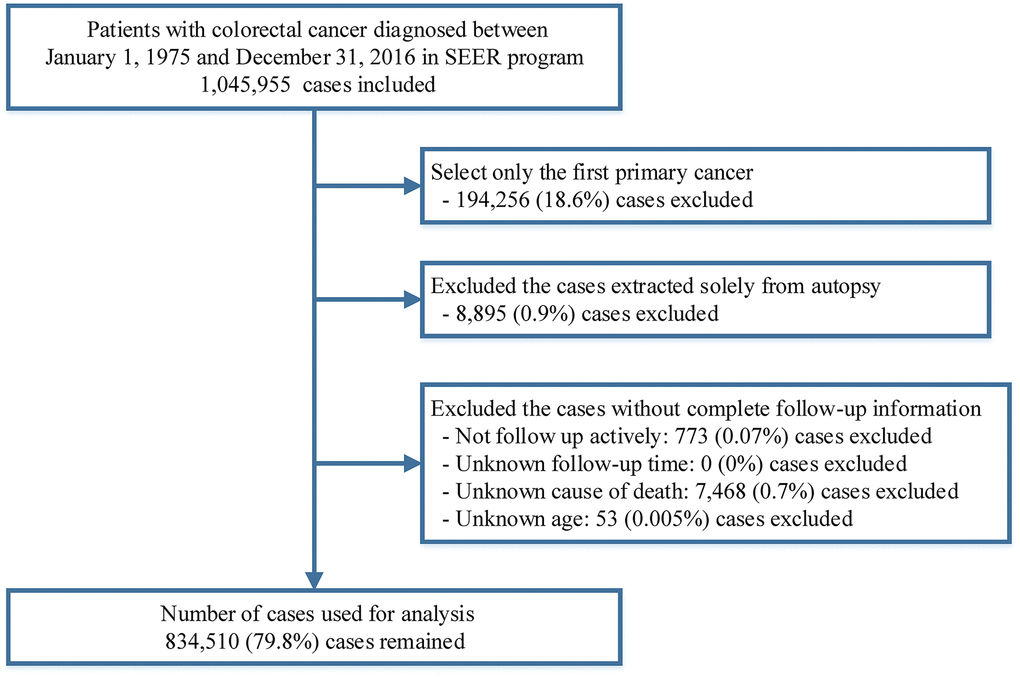All patients diagnosed with CRC between 1975 and 2016 were extracted from the SEER 18 database (2019 submission) using SEER*Stat software version 8.3.6 [58]. All types of cancers excluding a histology of mesothelial neoplasms (ICD-O-3 [International Classification of Diseases for Oncology third edition] codes: 9050-9055), Kaposi sarcoma (ICD-O-3 codes: 9140) and hematological malignancies (ICD-O-3 codes: 9590-9992) diagnosed in the colon and rectum (ICD-O-3 site codes: C18.0-C18.9, C26.0) were included in this study. Only the first primary diagnosis of colorectal cancer was included. Patients were excluded if their diagnoses were obtained only from death certificates or autopsies. We further excluded patients without active follow-up and those with unknown follow-up time, age at diagnosis or cause of death. (Figure 5). To analyze the causes of death among CRC patients as a function of calendar year of death, we extracted death data of CRC patients from 1975 to 2016 using the SEER-9 incidence-based mortality session, which accurately records the year of death but not the year of diagnosis for cancer survivors [59]. To compare with the general population, mortality data of the general US population collected by the National Center for Health Statistics between 1975 and 2016 were also extracted from the SEER program [60].