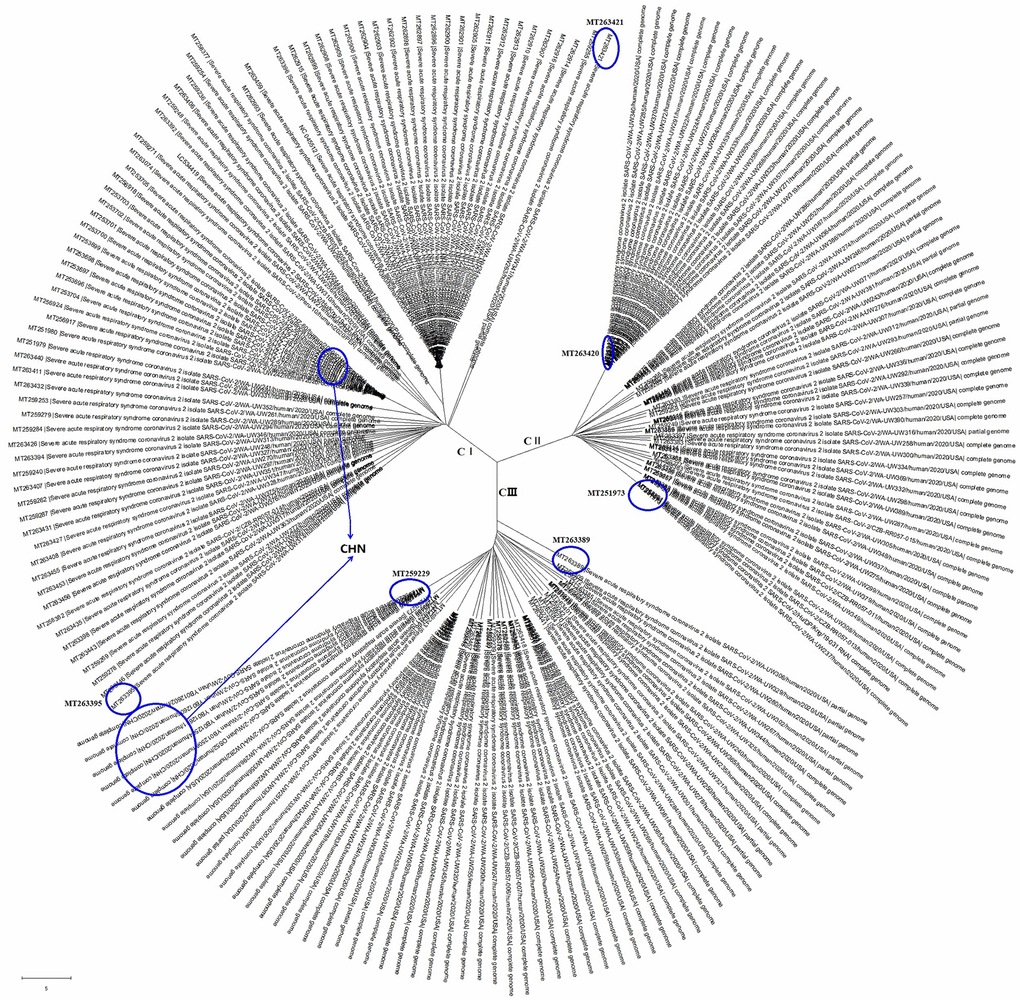 Here, we analyzed the complete genome sequences of 200 SARS-CoV-2 strains, including 176 from America (USA), 17 from China (CHN), 2 from Spain (ESP), 2 from Hungary (HUN), 1 from Peru (PER), 1 from Colombia (COL) and 1 from Pakistan (PAK), using the MEGA-X software [11]. As shown in Figure 1, the SARS-CoV-2 strains could be grouped into 3 clades, C I, CII and CIII. The viral genomes showed regional aggregation. The SARS-CoV-2 strains from China belong to the C III clade in the same branch of the evolutionary tree (GenBank accession numbers: MT259226, MT259230, MT259231, MT259227, MT259228, MT259229) or to the C I clade, also closely together in a same branch of the evolutionary tree (GenBank accession numbers: MT253704, MT253696, MT253697, MT253698, MT253699, MT253701, MT253702, MT253703, MT253705).
