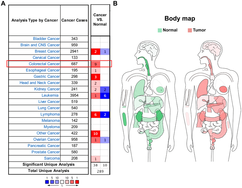 We obtained SEMA4C mRNA expression data from various cancer types using the Oncomine (https://www.oncomine.org/resource/login.html) database [37]. The threshold parameters were: P-value < 0.01; fold change ≥ 1.5; gene rank: top 10%; and data type: mRNA. We also analyzed relative SEMA4C mRNA expression levels in the tumor and normal tissue samples from different cancer types using the RNA-sequencing data from the TCGA and the Genotype-Tissue Expression (GTEx) projects with the interactive GEPIA (http://gepia.cancer-pku.cn) web server [38]. The pan-cancer expression profiles of SEMA4C were constructed based on the TCGA datasets using the Tumor Immune Estimation Resource (TIMER; https://cistrome.shinyapps.io/timer/) database [39]. We also downloaded the RNA-seq data of the TCGA-COAD and TCGA-READ cohorts from the Genomic Data Commons (GDC) and Application Programming Interface (API; https://gdc.cancer.gov/developers/gdc-application-programming-interface-api). The clinicopathological parameters of the TCGA-COAD and TCGA-READ patients were downloaded from the Firebrowse (http://firebrowse.org/) database. Only patients with fully characterized tumors and complete follow-up data were included. We also obtained mRNA expression and clinical data for 597 CRC samples and 51 normal samples from the TCGA database and analyzed the correlation between SEMA4C mRNA expression and clinicopathological characteristics. We downloaded the CMS subtyping data for the TCGA-CRC samples from the Colorectal Cancer Subtyping Consortium Synapse [6].