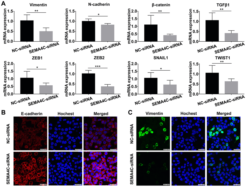 We further analyzed the mRNA and protein expression of EMT-related markers in the control and SEMA4C-silenced LoVo cells. Quantitative real-time PCR (QRT-PCR) analysis showed that SEMA4C knockdown significantly reduced the mRNA levels of EMT markers (Vimentin, N-cadherin, β-catenin), pro-fibrogenic factor (TGFβ1), and EMT-inducing transcription factors including ZEB1, ZEB2, SNAIL1, and Twist-related protein 1 (TWIST1) (Figure 10A). Immunofluorescence results demonstrated that SEMA4C knockdown increased the expression of E-cadherin (epithelial marker), and decreased the expression of the Vimentin (mesenchymal marker) compared to the corresponding controls (Figure 10B). These data suggest that SEMA4C promotes EMT in the CRC cells.