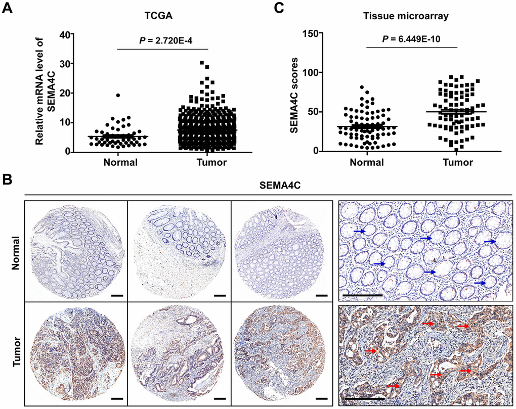 RNA-sequencing data analysis of the The Cancer Genome Atlas (TCGA)-CRC dataset (597 CRC and 51 normal colorectal samples) showed that the SEMA4C mRNA levels were significantly upregulated in the CRC tissues (P = 2.720E-4; Figure 2A). Furthermore, immunohistochemical analysis of a tissue microarray (TMA) with 83 matched colon cancer and adjacent normal colon tissues showed that SEMA4C protein levels were significantly upregulated in the CRC tissues (P = 6.449E-10); SEMA4C protein was mainly localized to the cell membrane and cytoplasm in the CRC cells (Figure 2B, 2C).
