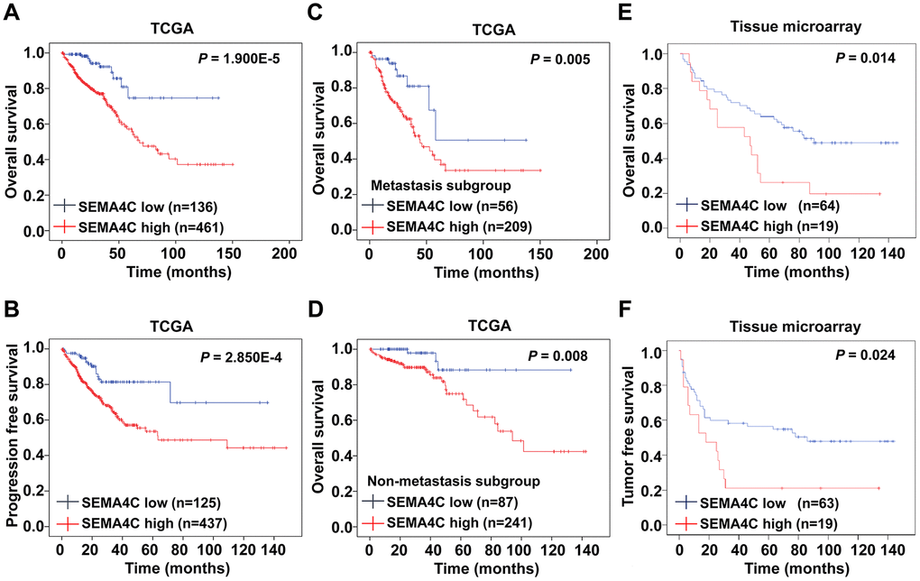 Next, we analyzed the prognostic value of SEMA4C in CRC patients. We divided the TCGA-CRC patients into high (n=461) and low SEMA4C expression groups (n=136) and evaluated their survival outcomes. Kaplan-Meier survival curve analysis showed that overall survival (OS) and progression-free survival (PFS) of the SEMA4C high expression group was significantly shorter than the SEMA4C low expression group (OS: P = 1.900E-5; PFS: P = 2.850E-4; Figure 3A, 3B). Besides, high SEMA4C expression correlated with significantly shorter OS in CRC patients with lymph node and distant metastasis (P = 0.005; Figure 3C) and CRC patients without lymph node and distant metastasis (P = 0.008; Figure 3D). Furthermore, CRC patients with high SEMA4C protein expression in the TMA-CRC cohort also showed poorer OS (P = 0.014) and tumor-free survival (TFS; P = 0.024) compared to those with low SEMA4C expression (Figure 3E, 3F).