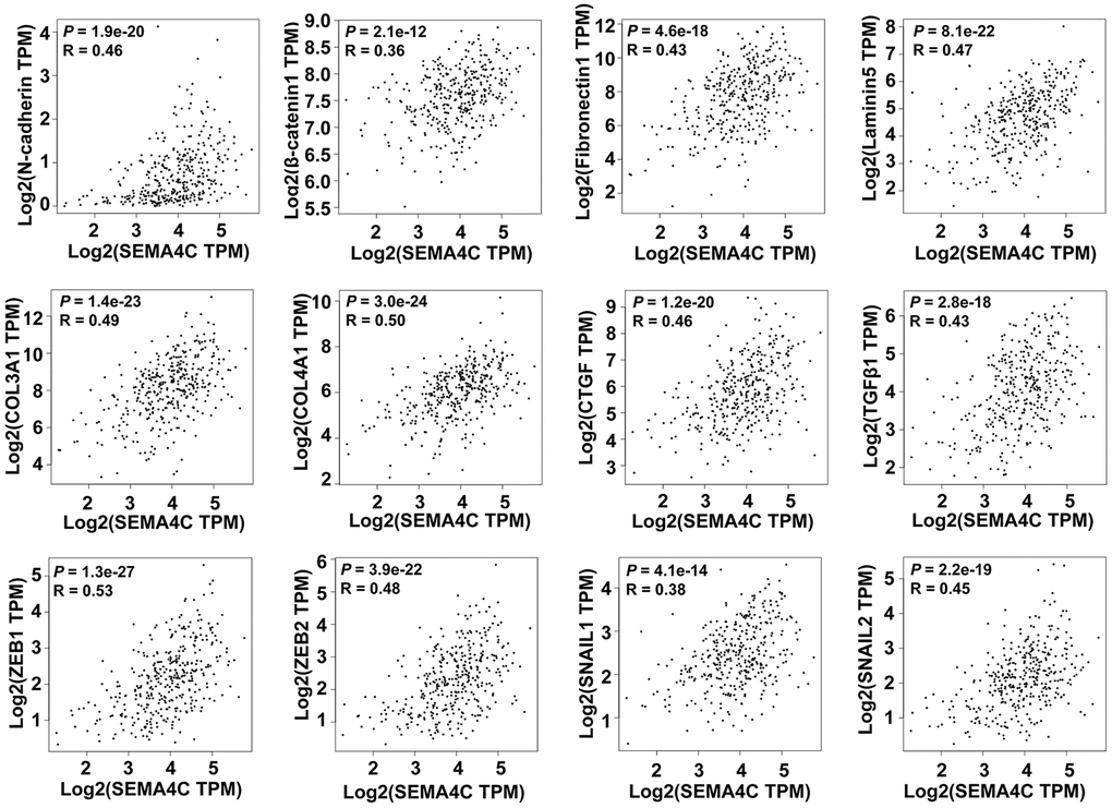 We analyzed the RNA sequencing expression data of CRC from the TCGA using the online database GEPIA (http://gepia.cancer-pku.cn/index.html) [38] to establish the correlation between the EMT-related genes and SEMA4C expression in CRC samples. The Spearman’s correlation co-efficient was evaluated for different genes and gene sets relative to SEMA4C expression.