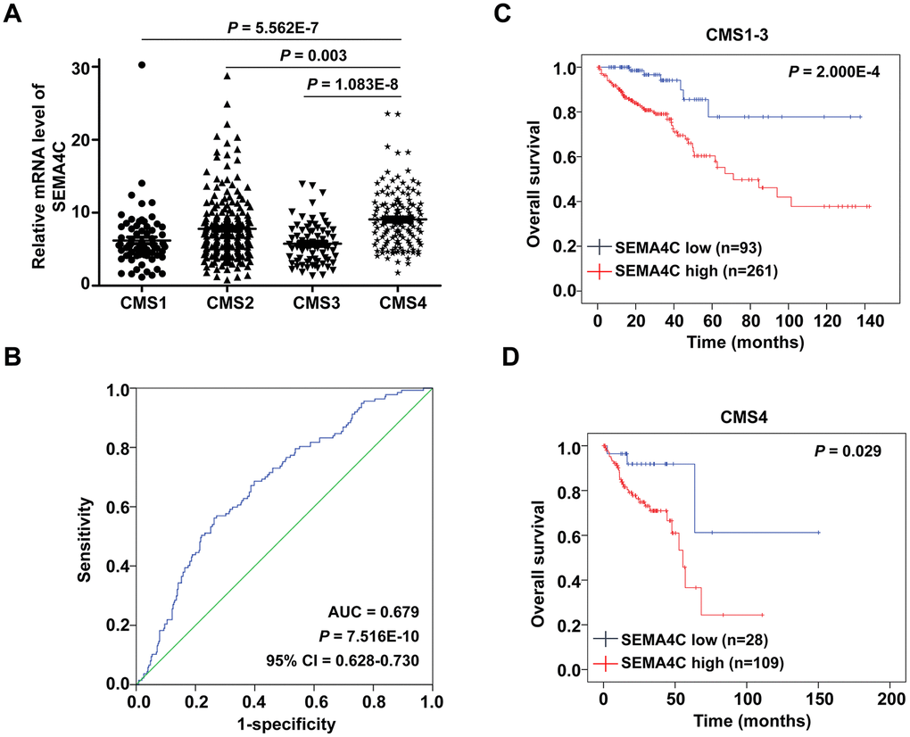 Recent studies have identified four consensus molecular subtypes (CMS) with unique tumor biology and gene expression patterns in the CRC patients [6, 7]. CMS4 tumors are characterized by high expression of genes related to EMT, TGF signaling, matrix remodeling, and high stromal cell content [6, 7, 30]. CRC patients in the CMS4 group are associated with worse disease-free and overall survival rates [31]. Although CMS is a highly sensitive method for stratifying CRC patients based on tumor progression, it is currently difficult to perform routine clinical testing to determine tumor classification based on genome-wide transcriptome data because it is associated with high costs and requires larger tumor samples for testing. Therefore, there is an urgent need to identify specific biomarkers that can help classify CRC patients into specific CMS groups. Our study demonstrated that high SEMA4C expression correlated with the CMS4 subtype. ROC curve analysis revealed that SEMA4C expression could accurately distinguish CMS4 patients from CMS1-3 patients. Overall, our results confirm that high SEMA4C expression strongly correlates with the EMT phenotype, and support a critical role of SEMA4C in the CMS4 evolution process.