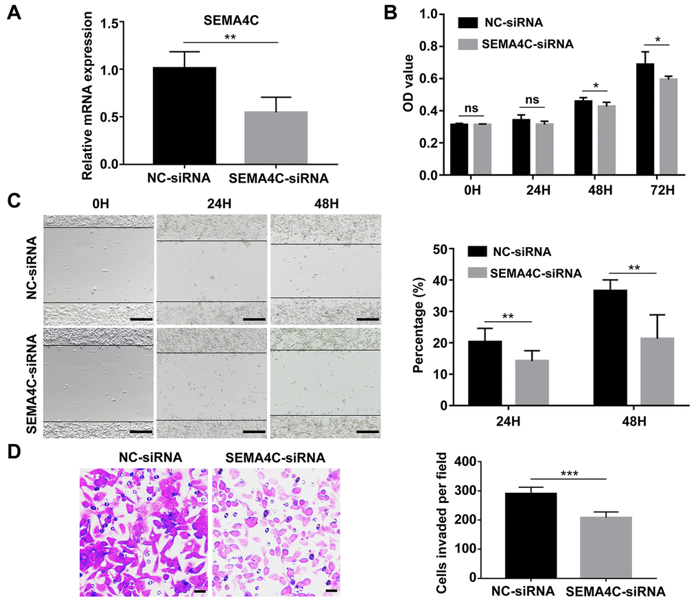 Next, we investigated the effects of SEMA4C silencing in the LoVo cells (metastatic human colon adenocarcinoma cell line). SEMA4C silencing significantly reduced SEMA4C mRNA expression in the LoVo cells compared to the corresponding controls (Figure 9A). Furthermore, CCK-8 assay results showed that knockdown of SEMA4C significantly reduced the proliferation of LoVo cells (Figure 9B). Moreover, wound healing assay results revealed that SEMA4C silencing significantly reduced the migration of LoVo cells compared to the corresponding controls (Figure 9C). Transwell invasion assay results illustrated that SEMA4C silencing significantly reduced the invasiveness of the LoVo cells (Figure 9D). These data demonstrate that SEMA4C knockdown reduces the growth and progression of CRC cells.
