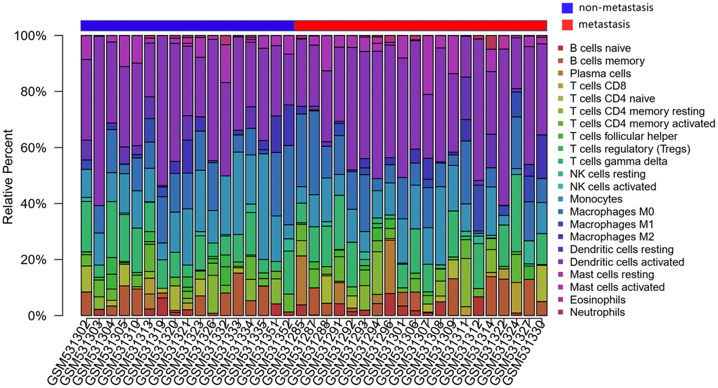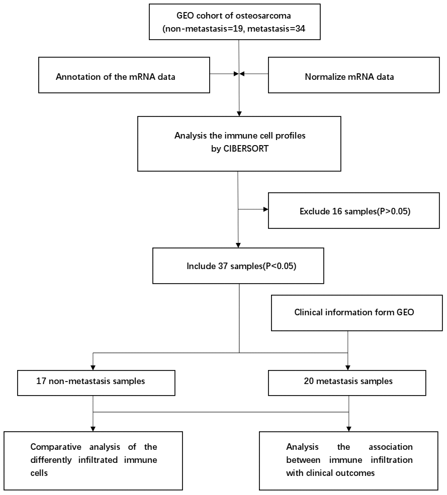 The expression data were downloaded from the Gene Expression Omnibus (GEO) database (http://www.ncbi.nlm.nih.gov/geo) [19]. GSE21257, a microarray dataset of 53 pre-chemotherapy biopsies from osteosarcoma patients, and these data were analyzed using the CIBERSORT signature. The patients’ clinical characteristics were also retrieved. Metastases occurred in 34 of the 53 osteosarcoma patients within five years, and did not occur in the other 19 patients. The samples from these 53 patients were included in subsequent analyses.