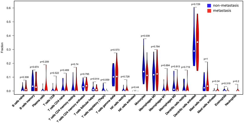 The CIBERSORT algorithm was used to investigate the differences in 22 subgroups of TIICs in metastatic and non-metastatic osteosarcoma samples. The flow diagram of our protocol and sample enrollment process is shown in Figure 1. In total, 17 non-metastatic tissues and 20 metastatic tissues met the inclusion criteria (P<0.05). The levels of the different TIICs in the metastatic and non-metastatic osteosarcoma groups are shown in Figure 2, and the fraction of immune cells is shown in Supplementary Table 1. When we compared the average proportion of each immune cell type between the metastatic and non-metastatic groups, we found that monocytes were more abundant in the non-metastatic group (P=0.039, Figure 3).