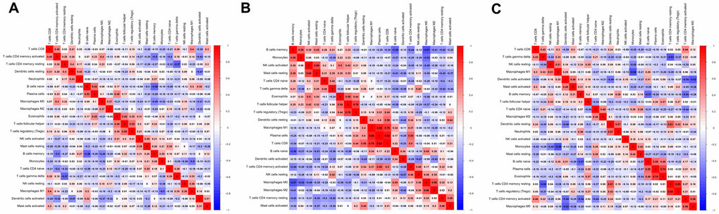 Next, we evaluated the correlations between different pairs of TIICs in osteosarcoma tissues to determine the relationships of various infiltrating immune cells to one another. Figure 4 displays the R value for each pair of immune cells in all patients, as well as in the non-metastatic and metastatic groups. Positive correlations are shown in red, while negative correlations are shown in blue. In all patients, regulatory T (‘Treg’) cell levels and follicular helper T cell levels exhibited the closest correlation, with an R value of 0.55. In contrast, there was a negative association between resting CD4+ memory T cell levels and γδ T cell levels (R=-0.57). In the non-metastatic group, CD8+ T cell levels correlated strongly with plasma cell levels (R=0.92), and plasma cell levels were positively associated with M1 macrophage levels (R=0.86), whereas memory B cell levels were negatively associated with M0 macrophage levels (R=-0.67). In the metastatic group, Treg cell levels and resting CD4+ memory T cell levels displayed the closest correlation, with an R value of 0.83. On the other hand, monocyte levels were negatively associated with M1 macrophage levels (R=-0.68). These results suggested that differences in the 22 subgroups of TIICs between metastatic and non-metastatic osteosarcoma tissues may be clinically significant.