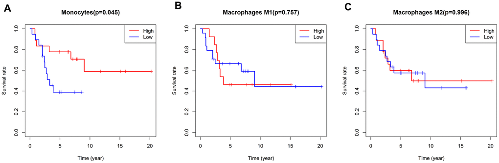 As mentioned above, the five-year survival rate of patients with metastatic osteosarcoma is extremely low, so new diagnostic and treatment methods are urgently needed to improve the prognoses of these patients. We analyzed the correlation between immune infiltration and survival time in the enrolled osteosarcoma patients, and found that a higher proportion of monocytes was associated with a better prognosis (P=0.045) (Figure 5). There were no differences in survival time according to the levels of the other TIICs.