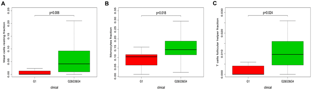 Next, we designed a nomogram based on the Huvos necrosis grade and the TIIC density to assess the relationship between TIICs and the effectiveness of chemotherapy. The fractions of resting mast cells (P=0.006), follicular helper T cells (P=0.018) and monocytes (P=0.024) were higher in patients with Huvos necrosis grades of 2, 3 and 4 than in those with a Huvos necrosis grade of 1 (Figure 6). These results indicated that higher fractions of resting mast cells, follicular helper T cells and monocytes were associated with greater chemotherapeutic effectiveness.