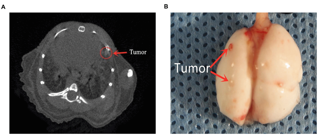 K7M2 WT cells (1 x 106) were injected into the tail veins of mice, ten days after a single injection, lung tumorigenesis was assessed using micro-CT. After the mice were euthanized, their lungs were dissected and fixed with formalin. In order to evaluate the extent of tumor metastasis more accurately, we fixed the right lung tissues of the mice, embedded them in paraffin and sectioned them at 100-μm intervals. H&E staining was performed so that metastatic nodes could be observed and counted under a microscope.
