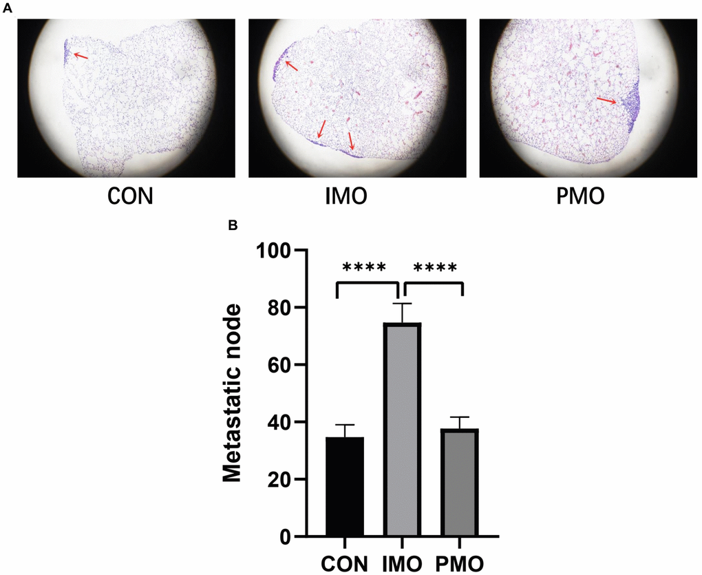 To verify the association between monocyte levels and osteosarcoma metastasis, we evaluated the lungs of three different groups of mice injected with K7M2 wild-type (WT) osteosarcoma cells. The control group was injected with phosphate buffered saline-loaded liposomes three days before the K7M2 WT transplant; the inflammatory monocyte (‘IMO’) group was injected with clodronate-loaded liposomes three days before the K7M2 WT transplant, and thus lacked PMOs; and the PMO group was injected with clodronate-loaded liposomes seven days before the K7M2 WT transplant, and thus exhibited normal PMO levels. Nine days after the K7M2 WT transplant, lung micro-computed tomography (micro-CT) was performed to confirm the formation of lung metastases (Figure 7A), and metastatic nodules in the lungs were photographed (Figure 7B). The extent of tumor metastasis was also evaluated via hematoxylin and eosin (H&E) staining of paraffin-embedded lung tissues (Supplementary Figure 1). Histologic examination of micro-metastatic lung lesions suggested that the IMO group had more metastatic nodules than the control and PMO groups; however, there was no difference between the control group and the PMO group (Figure 8A, 8B).