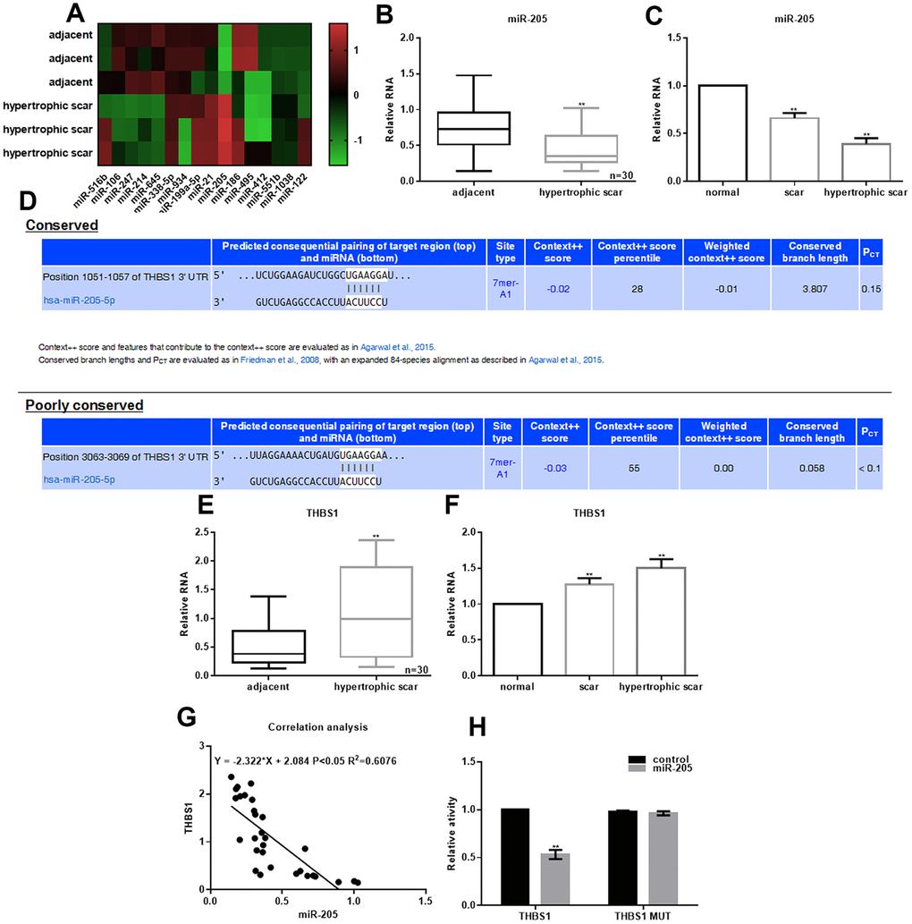 To investigate the expression of miRNAs between adjacent skin and hypertrophic scars, PCR-based microarrays were performed. Figure 1A shows the most significant changes in miRNA expression. miR-205 expression was also examined in 30 cases of hypertrophic scars and cells. Figure 1B shows that miR-205 expression was lower in hypertrophic scars than in the adjacent tissues. miR-205 expression was also lower in hypertrophic scar cells compared with the adjacent and scar tissues (Figure 1C). Moreover, Figure 1D shows that miR-205 directly binds with THBS13 '- UTR (TargetScan database). These results showed that THBS1 expression in hypertrophic scar tissue and cells was significantly upregulated (Figure 1E, 1F). There was a negative correlation between miR-205 expression and THBS1 in hypertrophic scars (Figure 1G). In the cells expressing miR-205, relative dual-luciferase activity of THBS1 wild-type promoter decreased about 40%, whereas in the cells expressing THBS1 mutant, there was almost no change (Figure 1H).