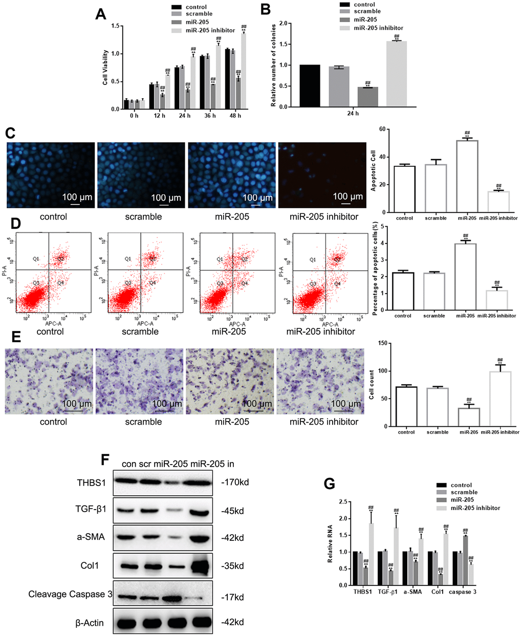 MTT assay and colony formation assay indicated that miR-205 overexpression hampered cell growth, whereas miR-205 deregulation promoted growth (Figure 2A, 2B). In addition, Hoechst 33258 and Annexin V-PI assay showed that apoptotic cells decreased in miR-205–deficient cells, but increased in miR-205–overexpressed cells (Figure 2C, 2D). In addition, miR-205 inhibition decreased cell migration regulation (Figure 2E). Similar to the important roles that TGF-β1, α-SMA, and Col1 play in hypertrophic scarring, Cleavage Caspase 3 is an important indicator of apoptosis. We also studied the effect of miR-205 on α-SMA, Col1, and TGF-β1 expression. Western blot and real-time PCR showed that miR-205 downregulated THBS1, TGF-β1, α-SMA, and Col1 expression, and upregulated Cleavage Caspase 3 (Figure 2F, 2G).