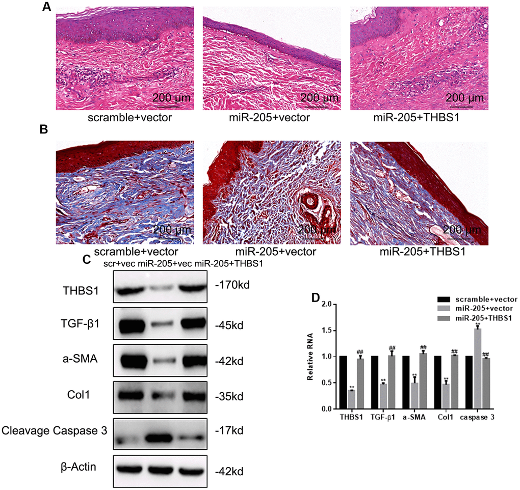 Our results further show that the regulatory effect of miR-205 on the biological function of hypertrophic scar fibroblasts are weakened by THBS1 transfection. In vivo experiments showed that miR-205 could inhibit hypertrophic scar formation and collagen synthesis.