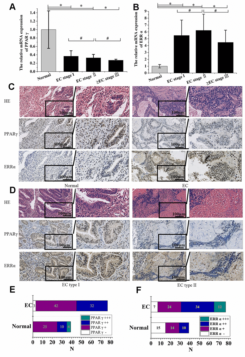 Peroxisome proliferator-activated receptor γ (PPARγ), a steroid hormone receptor, was discovered by Issemann and Green in 1990 and plays an important role in the regulation of glucose and lipid metabolism in some obesity-related cancers [6], such as breast cancer [7] and EC [8]. Early in 2006, Kyoko O et al. suggested that PPARγ immunoreactivity and mRNA levels were significantly lower in EC than in the normal endometrium [9]. Nickkho-Amiry et al. found that PPARγ activation reduced endometrial cell proliferation, that nuclear PPARγ was most abundant in benign endometrial tissue, and that nuclear PPARγ correspondingly decreased with increasing pathological grades [8]. Thus, PPARγ seems to act as a protective factor against EC. However, other studies have shown that PPARγ has protumorigenic effects in pancreatic cancer [10], metastatic prostate cancer [11], and bladder carcinoma [12]. Thus, the role of PPARγ in cancer remains controversial. Wei W et al. identified a conserved PPAR response element (PPRE) in the estrogen-related receptor α (ERRα) promoter and suggested that ERRα was a direct PPARγ target gene, specifically in osteoclastogenesis, by ChIP assay [13]. Coincidentally, Fujimoto J et al. demonstrated that ERRα was expressed at higher levels in EC tissues and was correlated with a poor prognosis in EC [14]. Moreover, we found that ERRα reduced EC cell proliferation and promoted apoptosis [15–17]. Thus, ERRα is a potential tumor biomarker and therapeutic target for EC. However, the potential mechanisms of ERRα and PPARγ in tumorigenesis are still unclear. In PubMed, no report focusing on the interaction between ERRα and PPARγ in EC is available. Therefore, we hypothesized that some crosstalk might occur between PPARγ and ERRα to promote EC carcinogenesis and progression. To clarify the possible biological and clinical roles of PPARγ and/or ERRα in human EC, we focused on the interaction between PPARγ and ERRα in EC cells in vitro and EC tissues in vivo. Furthermore, the downstream target pathways of PPARγ and ERRα in EC were explored based on bioinformatics data-mining analysis and further confirmed in cell lines. We also discuss the potential roles of PPARγ and ERRα in the EC diagnosis and try to determine the best threshold. Finally, the disease-free survival (DFS) and overall survival (OS) rates of EC patients with different expression patterns of PPARγ and ERRα were analyzed.