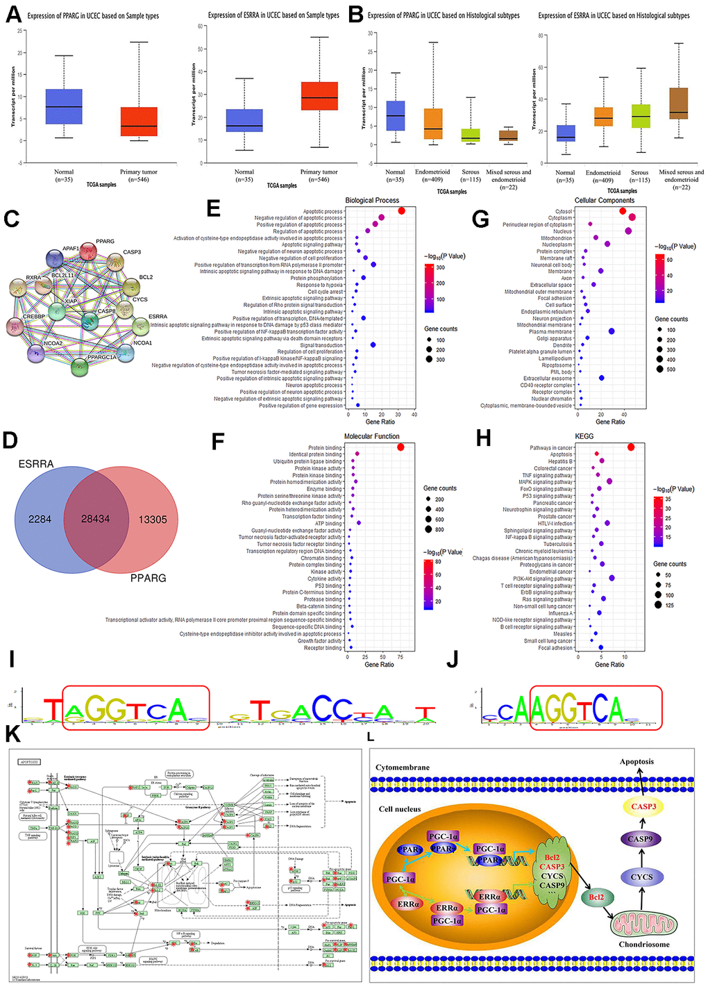 PPARγ and ERRα gene expression and EC were selected and queried on the http://ualcan.path.uab.edu/ website. UALCAN lists queried genes with links to gene expression analyses and survival data. Analysis of TCGA samples showed that PPARγ expression was higher in normal samples (n=35), and that ERRα expression was obviously increased in EC samples (n=546, P<0.001, Figure 2A). Moreover, PPARγ expression was higher in endometrioid adenocarcinoma (n=409) than in serous carcinoma (n=115, P<0.001, Figure 2B). However, no difference in ERRα expression was found between endometrioid adenocarcinoma and serous carcinoma (P>0.05, Figure 2B). These data were all consistent with our results described above. Although the STRING analysis revealed no research overlap between PPARγ and ERRα, the same cofactors, namely, PPARγ coactivator-1α (PGC-1α), nuclear receptor coactivator 1 (NCOA1), and cyclic adenosine monophosphate response element-binding protein (CREBBP), were reported to be shared between them. CREBBP can transcribe, coactivate and increase the expression of its target genes. PPARγ and ERRα can compete with the cofactor CBP to increase or decrease Bcl2 expression (Figure 2C). As shown in Figure 2D, the microarray data revealed 41,739 target genes of PPARγ and 30,718 target genes of ERRα. A total of 28,434 identical target genes, including Bcl2 and Caspase3, were found between PPARγ and ERRα (Figure 2D). Figure 2E–2G graphically depicts the most common GO codes for the three major GO categories. Further searches revealed a repeating sequence in both the PPARγ and ERRα genes (Figure 2I, 2J). These data suggested that a significant number of protein-coding genes with important biological functions, especially in the apoptosis pathway, may be regulated by PPARγ and ERRα. By KEGG analysis, we found that a large number of genes coregulated by PPARγ and ERRα are involved in the apoptosis pathway (Figure 2K). Further confirming our hypothesis, PPARγ and ERRα compete for the same cofactors and increase or decrease the same genes, including Bcl2 and Caspase3, involved in the apoptosis pathway (Figure 2L).