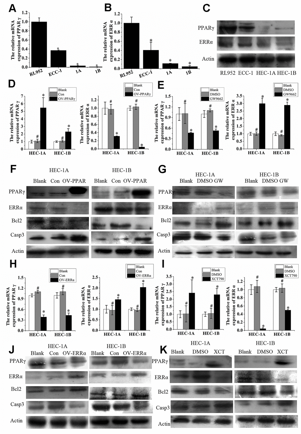 PPARγ and ERRα were both expressed in EC cell lines, including RL952, ECC-1, HEC-1A, and HEC-1B. Interestingly, the mRNA expression of PPARγ and ERRα was higher in the ERα-positive cell lines RL952 and ECC-1 than in the ERα-negative cells HEC-1A and HEC-1B (P<0.05, Figure 3A, 3B). The proteins were also expressed at high levels in the ERα-positive lines RL952 and ECC-1 and at low levels in the ERα-negative lines HEC-1A and HEC-1B (P<0.05, Figure 3C). A similar tendency was observed for PPARγ and ERRα protein expression in these EC cells. The semiquantitative PPARγ protein expression levels in RL952, ECC-1 HEC-1A, and HEC-1B cells were 1±0.0611, 0.6313±0.0696, 0.1566±0.0069, and 0.2027±0.0274, respectively, and the semiquantitative ERRα protein expression levels in RL952, ECC-1 HEC-1A, and HEC-1B cells were 1±0.0699, 1.0429±0.0378, 0.7135±0.0374, and 0.6514±0.0948, respectively. PPARγ expression was significantly increased, while ERRα expression was significantly reduced by lentivirus-mediated PPARγ overexpression in HEC-1A and HEC-1B cells (Figure 3D). PPARγ expression was decreased, while ERRα expression was increased when the same cells were treated with GW9662 (Figure 3E), a potent antagonist of PPARγ [18]. When PPARγ was overexpressed, Bcl2 protein expression was decreased, and Caspase3 protein expression was increased (Figure 3F). After treatment with G9662 for 48 h, Bcl2 protein expression was increased, and Caspase3 protein expression was decreased (Figure 3G). When ERRα was overexpressed in cells, PPARγ was downregulated (Figure 3H). Subsequently, ERRα was upregulated, and PPARγ was downregulated when ERRα was overexpressed by lentivirus in HEC-1A and HEC-1B cells (Figure 3H). ERRα was decreased, but PPARγ was increased in the same cells after treatment with XCT790, a specific ERRα antagonist (Figure 3I). When ERRα was upregulated, Bcl2 protein expression was increased, and Caspase3 protein expression was decreased (Figure 3J). After treatment with XCT790 for 48 h, Bcl2 protein expression was decreased, and Caspase3 protein expression was increased (Figure 3K). Taken together, these data indicate that PPARγ and ERRα participate in a negative feedback loop in EC. This regulatory pattern was also true for the Bcl2 and Caspase3 proteins (Figure 3F–3G and Figure 3J–3K).