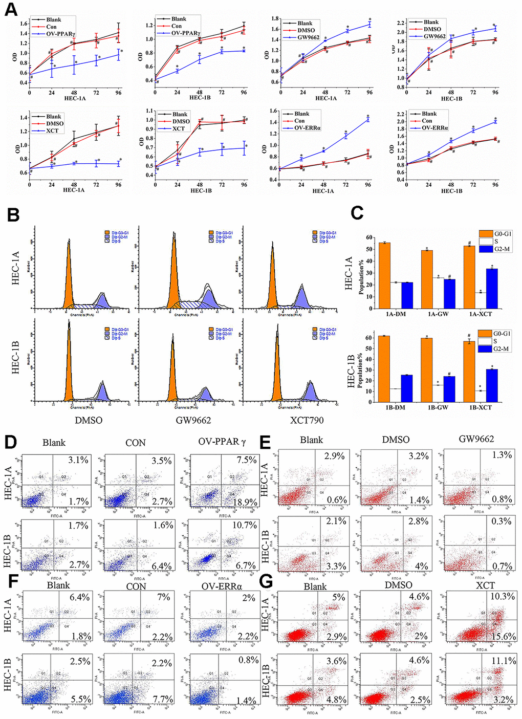 Our results showed that PPARγ overexpression slowed proliferation (Figure 4A), but that GW9662 treatment accelerated the proliferation of HEC-1A and HEC-1B cells (Figure 4A). Moreover, HEC-1A and HEC-1B cell proliferation was inhibited by XCT790 treatment (Figure 4A, P<0.05). The cellular proliferation rate was significantly increased when ERRα was overexpressed by a lentivirus (Figure 4A, P<0.05). The HEC-1A and HEC-1B cell cycles were analyzed after PPARγ and ERRα modulation. The data suggested that PPARγ downregulation by GW9662 led to G0-G1 phase shortening and S phase lengthening, while ERRα downregulation by XCT790 resulted in S phase shortening but G2-M phase lengthening in HEC-1A cells (Figure 4B-C). The same trend for the S phase and M phase was found in HEC-1B cells (Figure 4B, 4C). Apoptosis of HEC-1A cells and HEC-1B cells increased when PPARγ was upregulated (Figure 4D). In contrast, apoptosis of HEC-1A cells and HEC-1B cells decreased when PPARγ was downregulated (Figure 4E). Apoptosis of HEC-1A cells and HEC-1B cells decreased when ERRα was upregulated by a lentivirus (Figure 4F). Treatment with XCT790 significantly increased cell apoptosis (Figure 4G).