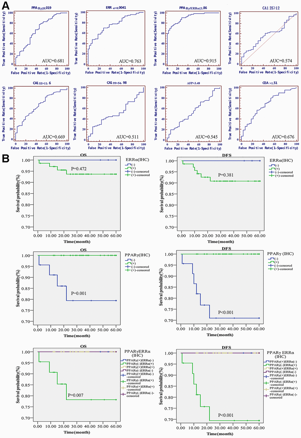 The 5-year OS rates were significantly higher for patients with PPARγ-positive disease than for those with PPARγ-negative disease (100.00% vs. 88.24%; p=0.001). The difference between the 5-year DFS rates for PPARγ-positive and PPARγ-negative patients was also significant (100.00% vs. 82.35%; P<0.001) (Figure 5B). However, no difference in OS or DFS was found between ERRα-positive and ERRα-negative patients. When using PPARγ/ERRα as a predictor of prognosis, we found that OS and DFS were lowest for PPARγ-negative and ERRα-positive patients (OS: 100.00% vs. 85.19%, P<0.001; DFS: 100.00% vs. 77.78%, P<0.001, Figure 5B).