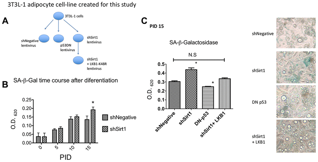 In this study, we created the following 3T3-L1-based cell lines using lentiviruses: 1. shNegative expressing cells (as an infection control), 2. Dominant-negative p53 expressing cells, 3. shSirt1 expressing cells to knock-down Sirt1, and 4. shSirt1 + LKB1 K48R expressing cells (Figure 1A). The differentiation procedure was standard for 3T3-L1 cells. Many studies use differentiated cells at 8-10 PID (post induction date). However, to evaluate senescence, we examined up to 15 PID, a time-frame longer than typically used. We assessed SA-β-Gal activity by using X-gal as a substrate. In brief, formalin-fixed 3T3-L1 cells were quantified colorimetrically (Figure 1B, 1C). After the commencement of differentiation, SA-β-Gal steadily increased until it plateaued by 10 PID. There was no further increase in staining between 10 and 15 PID in shNegative cells. In general, senescence was induced by expression of p53. Lentiviral transduction of dominant-negative p53 decreased SA-β-Gal activity, corroborating the presence of cellular senescence (Figure 1C). Knock-down of Sirt1 showed a slightly higher SA-β-Gal staining in 5-10 PID which significantly increased at 15 PID (Figure 1B, 1C). In a previous paper, we demonstrated that the LKB1 K48R mutant is active without Sirt1 [15]. Thus, to determine the effect of LKB1, independent of Sirt1, we expressed the LKB1 K48R mutant using lentivirus in Sirt1 knock-down cells to determine its effects on senescence. At 15 PID, SA-β-Gal staining was no different than the shNegative control demonstrating that it suppressed or prevented the Sirt1 knock-down effect (Figure 1C).