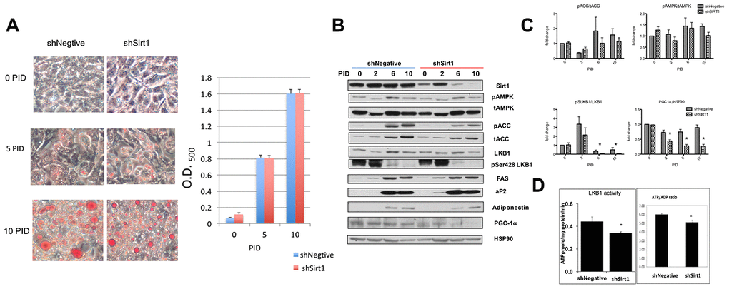The effects of shSirt1 and LKB1 K48R on increasing and decreasing SA-β-gal staining, respectively, at 15 PID suggested that some drastic change may occur after the completion of differentiation (10 PID). Thus, we investigated the molecular and phenotypic changes that occur up to 10 PID, first. We assessed fat accumulation by Oil-Red O staining (Figure 2A) along with pAMPK (pT172-AMPK), pACC (AMPK substrate), total-AMPK, total-ACC, and LKB1 expression and activity (Figure 2B, 2C). Full fat accumulation was observed at 10 PID. Colorimetric analysis of oil-red staining showed no difference in fat accumulation between shNegative- and shSirt1-infected cells. We assessed insulin-stimulated glucose uptake and isoproterenol stimulated glycerol release and found no effect of Sirt1 knock-down (data not shown). Adipocyte differentiation markers FAS, aP2, and adiponectin became evident at 6-10 PID (Figure 2B). In shSirt1 cells, Sirt1 expression was 80-90% reduced at 6-10 PID, but there were no remarkable changes in these differentiation markers, supporting the Oil-Red O staining results.