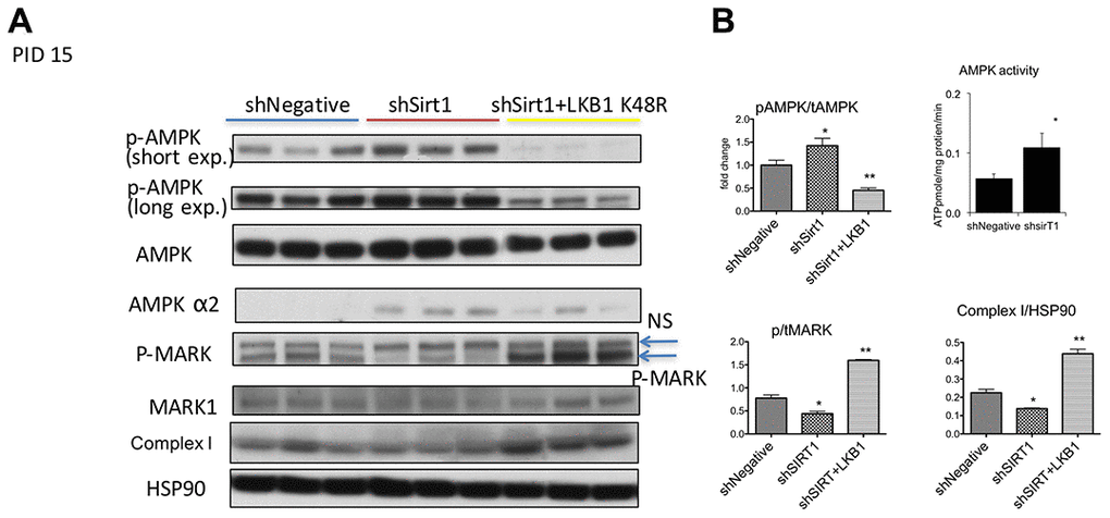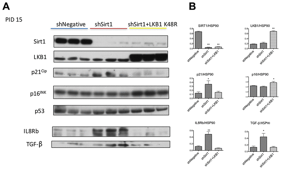 Here, we found that Sirt1 knock-down further increased SA-β-Gal expression after differentiation at 15 PID, but unexpectedly AMPK expression and activity (pT172) were upregulated despite apparent downregulation of LKB1 activity. This phenomenon was accompanied by the downregulation of mitochondrial complex I expression. Pro-senescence p21Cip and pro-inflammatory receptor IL8Rb expression were strongly upregulated, as was TGF-β. Lentiviral expression of LKB1-K48R, which does not require Sirt1-dependent activation, corrected all of these abnormalities including upregulation of AMPK expression and activity. Therefore, LKB1 downregulation is the main contributor to senescence induced by Sirt1 knockdown. Consistent with LKB1's role, ectopic expression of LKB1 largely prevented cellular senescence in cultured human aortic endothelial cells. Our results show a novel role of LKB1 in the aging process.