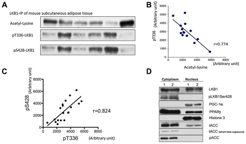 We examined whether suppression and activation of LKB1 via acetylation can occur in adipose tissue of the mouse in vivo. Previously we demonstrated that knock-down of Sirt1 increases LKB1 acetylation while Sirt1 overexpression and activation by resveratrol decreases acetylation [15]. Therefore, the acetylation status of LKB1 is a likely indicator of Sirt1 activity. In vivo, Sirt1 activity can be modulated by circadian rhythm and feeding-fasting cycle, thus, we expected that LKB1 acetylation may fluctuate. LKB1 was immunoprecipitated from mouse subcutaneous adipose tissues and blotted with acetyl-lysine, pS428, and pT336, a primary auto-phosphorylation site (Figure 5A). Phosphorylation of T336 LKB1 only occurs when LKB1 forms the active complex with STRAD and MO25, thus, is an indicator of LKB1 activation. We found that LKB1 acetylation was negatively correlated with pT336 (Figure 5A, 5B). In addition, there was a strong positive correlation between pT336 and pS428 (Figure 5A, 5C). The results suggest that Sirt1 activity may control LKB1 activity in vivo and this can be monitored by assessing pSer428 LKB1. We previously demonstrated such a relationship in aortic endothelium after acute exercise [29].
