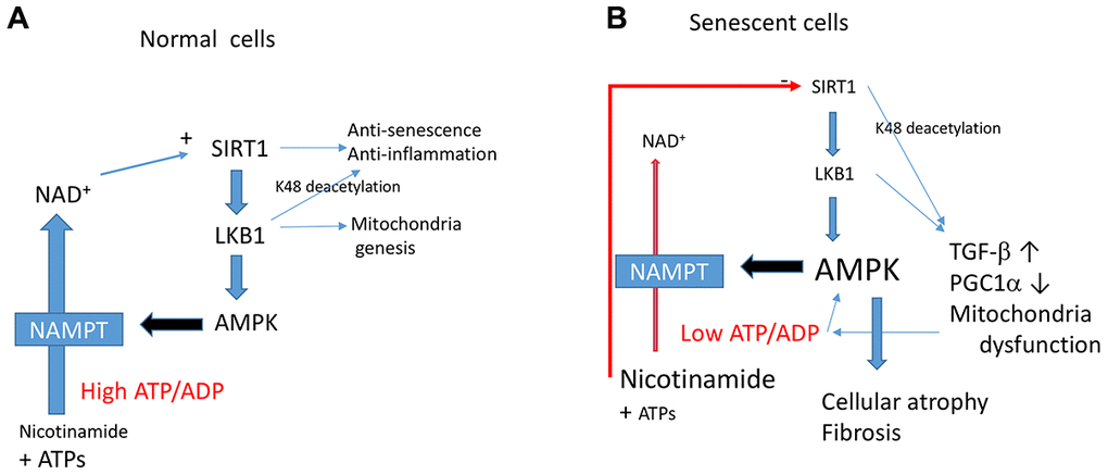 So, what are the factor(s) determining senescence-promoting effects of AMPK? Although we do not have clear answers, this study gives us some hints. AMPK is known to regulate energy homeostasis, to maintain ATP levels under stress conditions [11]. However, cells that undergo senescence show lower energy status as shown by others [38] and by us in this study. Thus, AMPK activation during the senescence process fails to maintain energy levels. AMPK activation upregulates catabolic processes to produce more ATP [11]. Increased expression of NAMPT (nicotinamide phosphoribosyltransferase) by AMPK, which synthesizes NAD+ from nicotinamide, could be one of such cascades [49]. This leads to increasing NAD+, which activates sirtuins [49], including Sirt1. Thus, in normal cells, the AMPK-NAMPT-Sirt1 cascade activates PGC-1α for mitochondrial biogenesis to restore energy levels (Figure 7A). It was demonstrated in hepatocytes that cytosolic NAD+ levels are controlled by ATP levels [50]. Thus, if ATP levels are continuously low, NAD+ levels are also low, and in such case, no activation of sirtuins would occur despite activation of AMPK. Since activation of AMPK inhibits protein synthesis [51], this induces cellular or tissue atrophy as observed in aged tissues. Sirt1 inhibition by accumulation of nicotinamide likely accelerates this process giving rise to the aging phenotype. This would lead to the downregulation of LKB1 activity (Figure 7B), as shown in this study, which is consistent with previous observations [15, 17]. We found that activation of LKB1 by LKB1 K48R reverses the effects. Thus, LKB1 activation may be a critical point. LKB1, directly and indirectly, controls many molecules by phosphorylation [13]. AMPK-independent effects of LKB1 on energy metabolism, including mitochondrial biogenesis, are less well known, but there are a few examples. Schwann cell-specific LKB1 knock-out mice revealed declining NAD+, ATP, and axonal degeneration that resembles diabetic neuropathy despite activation AMPK [52]. In that paper, double knock-out of AMPK α1&2 subunits did not show the same phenotype, confirming an AMPK independent effect. Similarly, LKB1 deficient hematopoietic stem cells showed mitochondrial defects and decreased ATP levels [53–55]. These phenomena were not observed in AMPK α subunits double knock-out mice [55], suggesting AMPK independent effects. Thus, there is a link between LKB1 and mitochondrial function independent of AMPK, and this issue is worth further investigation.