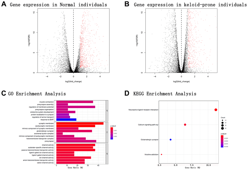 This study showed that during wound healing, DEmRNAs expressed only in keloid-prone individuals were mainly enriched in various ion channels in GO MF categories. KEGG pathway analysis further showed that these DEmRNAs were enriched mainly in the calcium signalling pathway. Liang et al. reported a similar finding in a microarray study focusing on DElncRNAs and DEmRNAs between keloid tissue and normal skin tissue and found that the lncRNA CACNA1G-AS, an antisense RNA to CACNA1G, which encodes a calcium channel subtype, was upregulated in keloid tissue in independent pairs of samples [14]. Calcium channels are associated with reactions to mechanical forces in different cell types, and elevated intracellular calcium levels were observed in fibroblasts and keratinocytes under application of hydraulic pressure [15]. Promotion of calcium channel expression could positively affect the migration of keloid fibroblast cells [16]. L-type calcium channel blockers, such as verapamil, have already been used in clinical treatment for keloids and have been proven to be safe and effective [17]. These results collectively suggest that dysregulation of a mechanical signal-related network, with mediation of calcium channel activation, could be pivotal in keloid development. KEGG pathway analysis also showed that the glutamatergic synapse pathway might also play an important role. Evidence has shown immunoreactivity of L-glutamate and its ionotropic receptor NMDAR in the human epidermis [18–20]. These effects may cooperatively regulate the calcium levels in related tissues and cells, as previously reported [21]. Moreover, our findings showed that neuroactive ligand-receptor interactions might also contribute. A 2018 bioinformatic analysis of the molecular mechanism of pathological scarring by Zhang et al. noted that genes expressed in scar tissues were enriched in this channel [22]. The neuroactive ligand-receptor interaction pathway includes hundreds of genes involving many types of neuroreceptors, suggesting a broader, yet-to-be-discovered, complex neuroactive ligand-receptor mediated network; therefore, further investigations are needed. Moreover, GO analysis showed that the genes were enriched not only in the BP terms muscle contraction, presynapse assembly, and regulation of membrane potential but also CC terms related to different structural parts of synapses. Last, by KEGG analysis, we also found DEmRNAs enriched in the nicotine addiction pathway, which has not been reported in previous studies and awaits experimental verification.