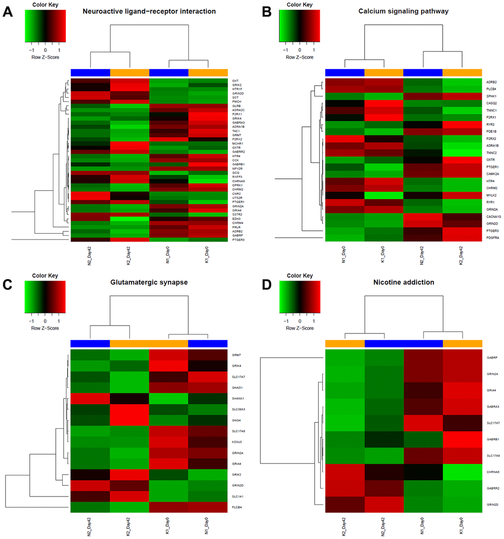 To more comprehensively analyse the roles played by the DEmRNAs, we performed KEGG pathway analysis. The DEmRNAs were enriched mainly in the neuroactive ligand-receptor interaction, nicotine addiction, calcium signalling pathway, and glutamatergic synapse pathways. The enrichment of DEmRNAs is shown in Figure 1D and Table 2. The gene names and expression heatmaps for each pathway are shown in Figure 2.