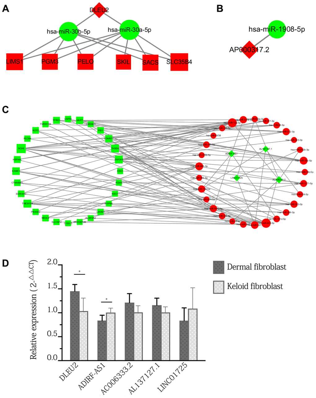 We found that a total of 6 lncRNAs were involved in the network: ADIRF-AS1, DLEU2, AP000317.2, AC006333.2, AL137127.1, and LINC01725. Among these DElncRNAs, DLEU2 and AP000317.2 were upregulated, and the others were downregulated. The ceRNA sub-network in which these lncRNAs are involved is shown in Figure 4A–4C. The experimental design for acquisition of the original GEO data involved invasive surgery on uninjured skin of patients with keloid scars. Therefore, no matching data can be found in public databases. To verify the expression of the DElncRNAs, we used pathological specimens of keloid scars as a substitute to compare with normal skin. The results showed that only the expression of DLEU2 and ADIRF-AS1 in keloid fibroblasts showed significant difference and that the expression of other genes was not changed significantly. We cannot exclude the possibility that our results were affected by differences in the sequencing models or qPCR analysis. Although these lncRNAs have not been reported in previous keloid-related literature, molecules such as DLEU2 and ADIRF-AS1 have been detected in other tissues and diseases [23, 24]. DLEU2, a gene located on chromosome 13q14, has frequently been observed to be deleted or epigenetically suppressed in leukaemia and is considered a tumour suppressor [24, 25]. Wu et al. found that the pattern of high lncRNA DLEU2 expression or low miR-30a-5p expression was an unfavourable prognostic factor for survival and tumour recurrence in patients with non-small cell lung cancer and showed that the lncRNA DLEU2 accelerates the development of cancer by sponging miR-30a-5p [24]. In this study, we predicted that DLEU2 acted on target genes, including development-related genes (such as LIMS3), apoptosis-related genes (such as SKIL), differentiation-related genes (such as PELO), and protein transporter-related genes (such as SLC35B4), through miR-30a-5p or miR-30b-5p, suggesting that DLEU2-associated ceRNAs may play an important regulatory role in keloid formation and wound healing. This possibility awaits verification by more basic and clinical experimental data.