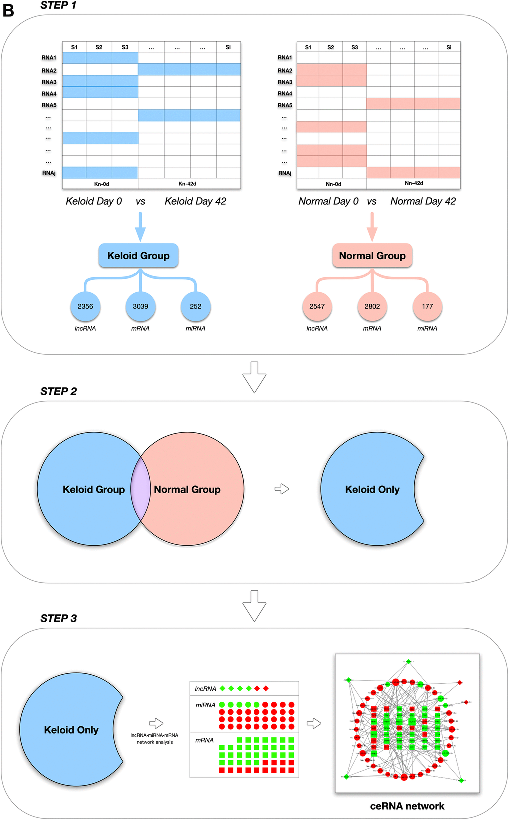 In this study, sequencing and microarray data related to keloid formation were downloaded from the open-source National Center for Biotechnology Information (NCBI) Gene Expression Omnibus (GEO) database, and secondary data analysis was conducted by combining the R language with network database bioinformatic analysis technology. This analysis aimed to identify the coding RNAs (messenger RNAs, mRNAs) and non-coding RNAs (ncRNAs), including microRNAs (miRNAs) and long non-coding RNAs (lncRNAs), expressed during keloid formation and to predict their expression and relationships. Through this research, we intended to verify the possibility of secondary bioinformatic analysis of sequencing and microarray data to extract lncRNAs and construct a competing endogenous RNA (ceRNA) network and simultaneously mine these data for information related to regulation of the pathophysiological process of keloid formation. This study offers new research methods for more comprehensive exploration of keloid pathogenesis and treatment.