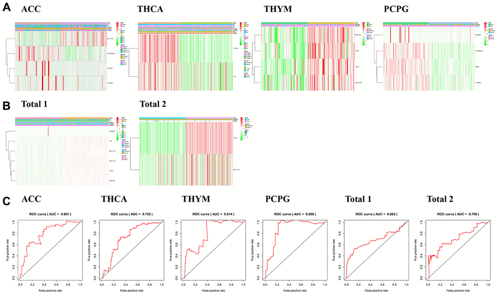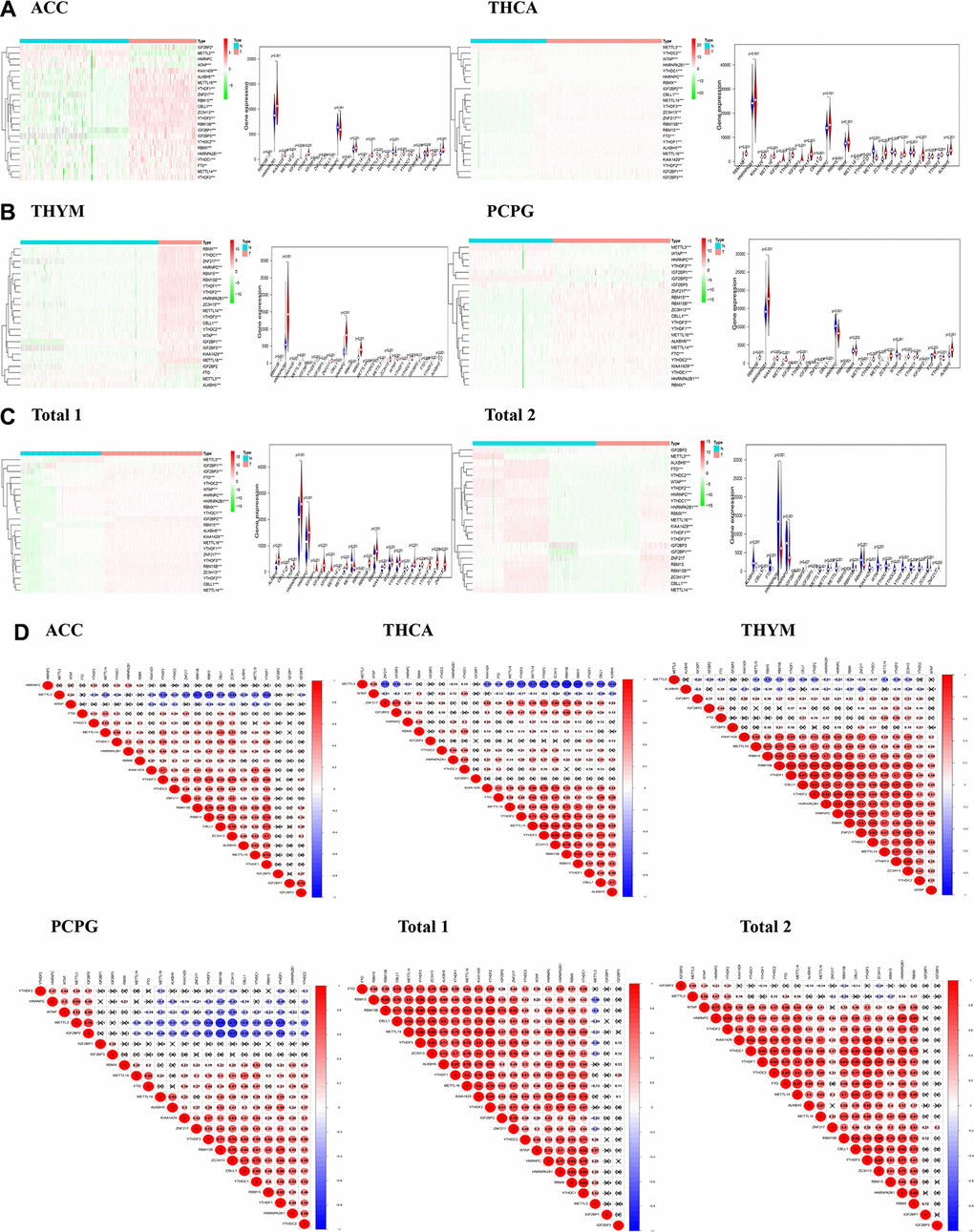 In order to study the common characteristics of the expression value of m6A regulatory genes between endocrine system tumors, we divided the four groups of tumors for different clinical variables into two groups. “Total 1” is the dataset of ACC and THCA, mainly analyzing the clinical information of their common survival time, survival status, gender, grade, tumors range and lymph node metastasis. “Total 2” is the dataset of PCPG and THYM, mainly analyzing the only clinical information of survival time, survival status and gender (Figure 5).