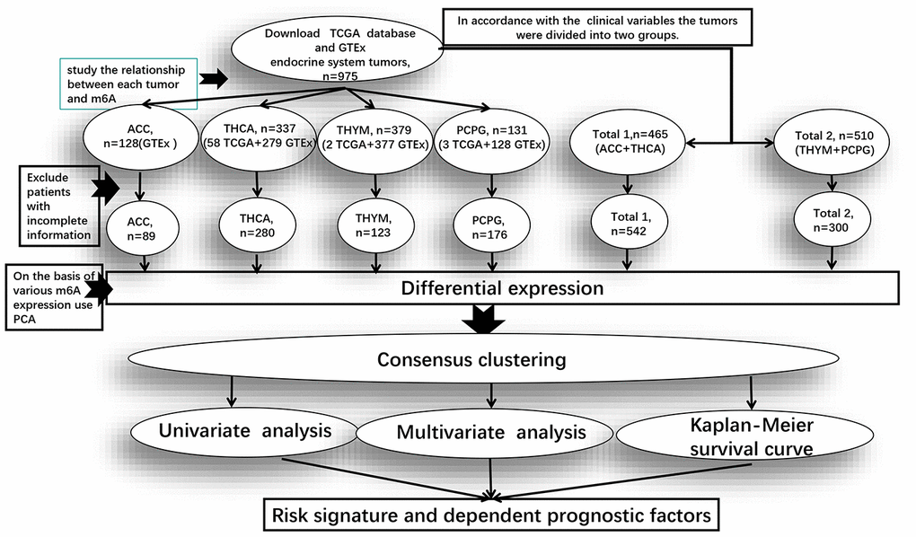 According to the recent data, the incidence of endocrine system tumors is increasing year by year, although the proportion is not large which cannot be ignored [1]. Despite advances in the diagnosis and treatment of endocrine tumors (adrenal cortical carcinoma (ACC), pheochromocytoma and paraganglioma (PCPG), thyroid carcinoma (THCA) and thymoma (THYM)) in recent decades, some patients still have a poor prognosis, especially ACC [2]. Recently, a number of studies have found that m6A regulatory genes play important roles in the occurrence and development of tumors [3], which also include the endocrine system tumors [4].